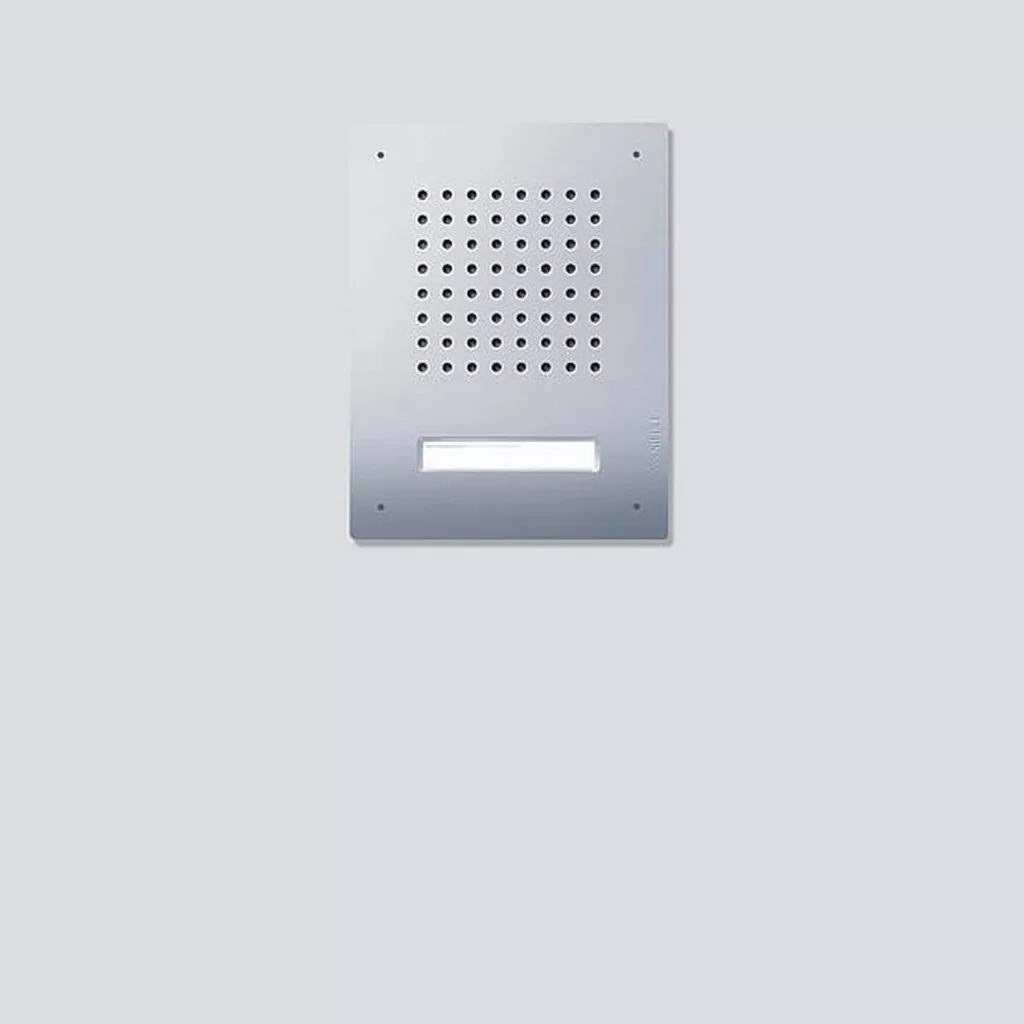 Klasszikus ajtóállomás az In-Home buszhoz, rozsdamentes acél elülső, V4A szálcsiszolt. Ajtós hangszóró, 1 hívógomb háttérvilágítású típustáblával, elöl cserélhető.