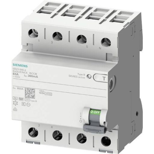 RCCB, 4 pólusú, B+ típusú, rövid idejű késleltetés, Be: 40 A, 300 mA, Un AC: 400 V Az RCCB egy hibaáram védőberendezés a véletlen érintés ellen. fontos része a SENTRON védőelemeinek az elektromos szereléshez, mert a veszélyes földelési maradékáramok biztonságos lekapcsolásával megelőzik az életveszélyes elektromos baleseteket. Az elektromosan felgyújtott tüzek azonnal megelőzhetők, amint azok kitörnek. Akár a feszültség alatt álló részek közvetlen érintésével működés közben, akár a berendezés közvetett megérintésével – a védelem elsősorban a gyors kikapcsolással érhető el. A Siemens 5SV RCCB főbb jellemzői a következők: 1. Átfogó védelem emberek és vagyontárgyak számára az áramütés ellen. 2. Legyen szó szinuszos AC maradékáramról vagy egyenletes egyenáramról – a Siemens minden igényhez a megfelelő típust és speciális változatokat kínálja. 3. Megbízható biztonság a szerelés során az alapfelszereltséghez tartozó markolat- és érintésvédelemnek köszönhetően. 4. Szerszámmentes leszerelés a kalapsínről vagy a gyűjtősín-szerelvényről a kényelmes csúszó-kezes kezelésnek köszönhetően. 5. A készülék előlapján található adatmátrix kód gyorsan és egyszerűen megad minden információt a hibaáram-megszakítóról. 6 A szabványok szerint védeni kell: A hibaáram-megszakítók megfelelnek a DIN VDE előírásainak. 7. Optimális technológia az Ön biztonsága érdekében – csak a Siemenstől.
