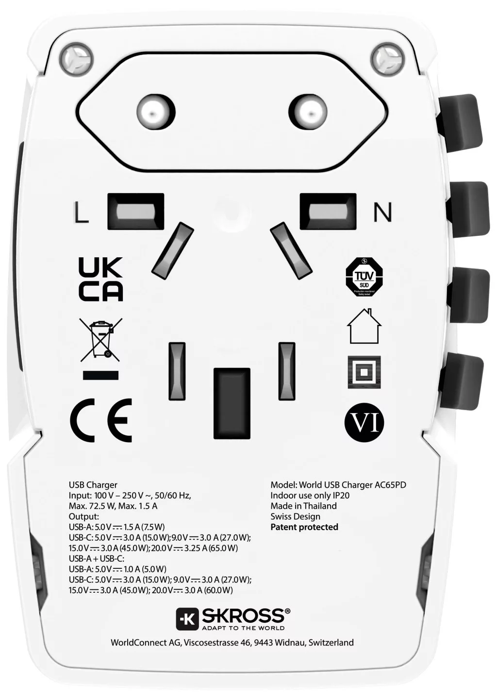 Az egyedülálló országos csúszkarendszernek köszönhetően a World USB Charger AC65PD egyidejűleg két USB-eszközt képes táplálni több mint 220 helyen világszerte. Ideális minden USB-eszköz, például laptopok, okostelefonok, táblagépek, power bankok, fényképezőgépek vagy e-könyv olvasók töltésére.