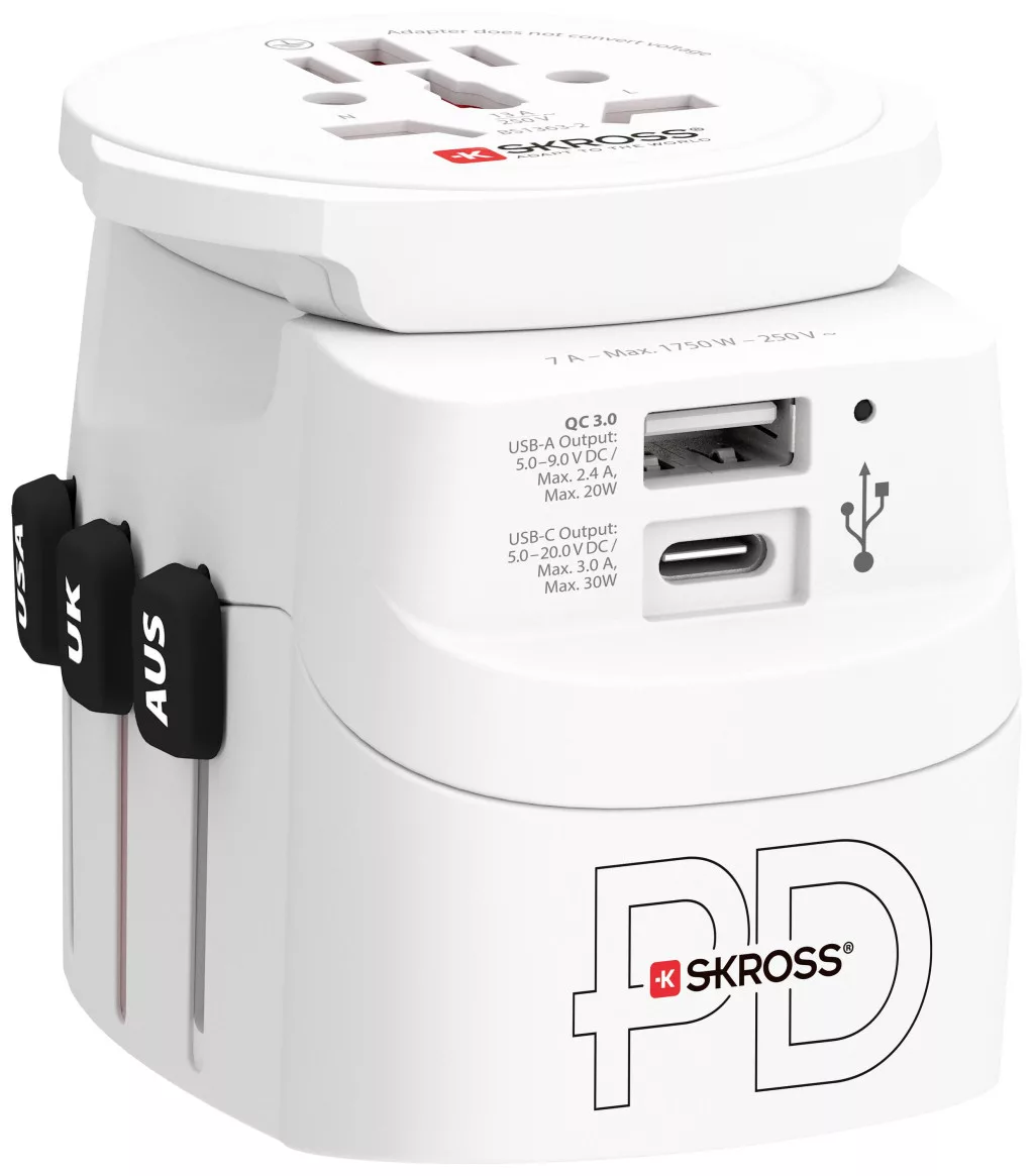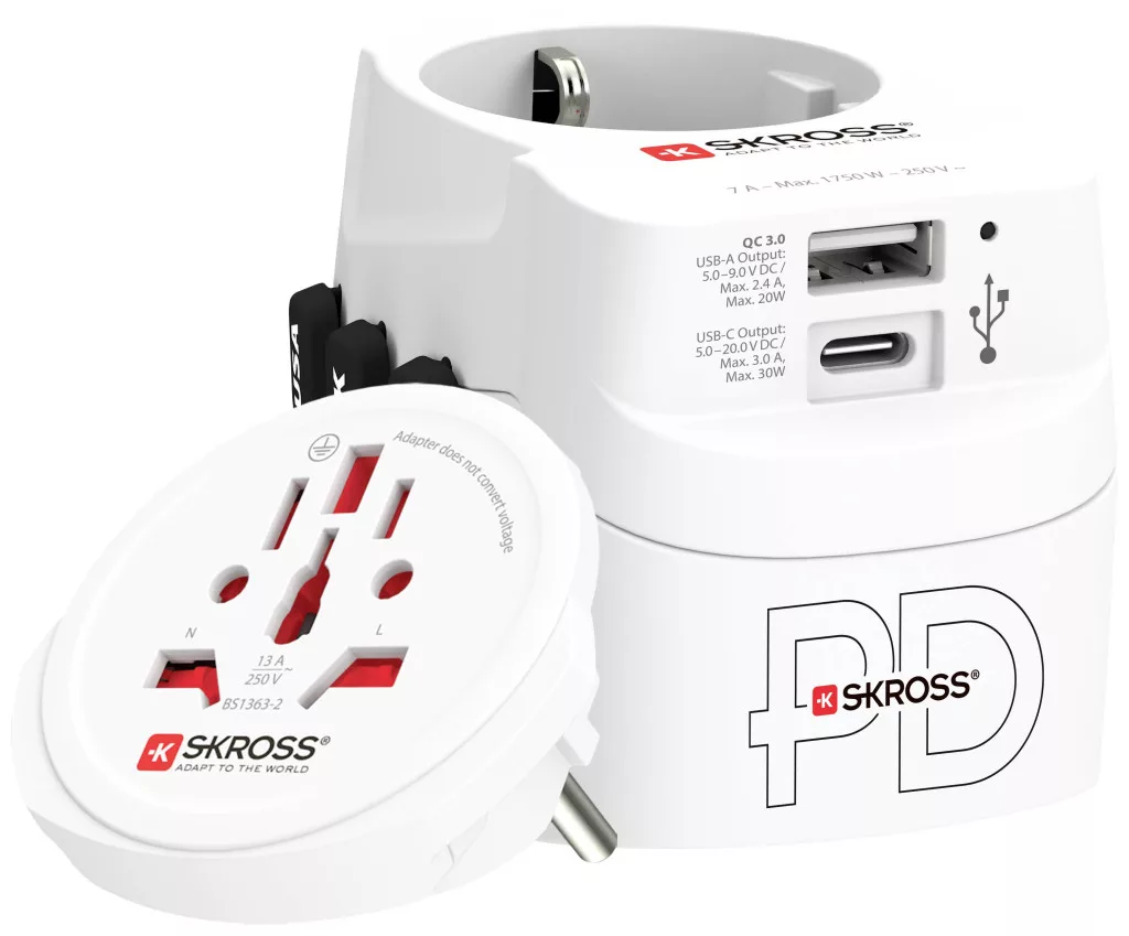 A PRO Light USB AC30PD - World biztosítja a 2- és 3-tűs eszközök egyszerű és biztonságos csatlakoztatását több mint 200 célállomásra. Az akár 1750 W-os rendelkezésre álló teljesítmény egyedülállóvá teszi a PRO Light USB-t, ha olyan nagy teljesítményű eszközökkel használják, mint például laptopok és utazási hajszárítók. Ezenkívül a beépített kettős USB-port elegendő energiát kínál két USB-eszköz (1 x USB C és 1 x hagyományos USB-eszköz) egyidejű kényelmes töltéséhez, még akkor is, ha egy másik eszköz csatlakozik az adapteren keresztül.