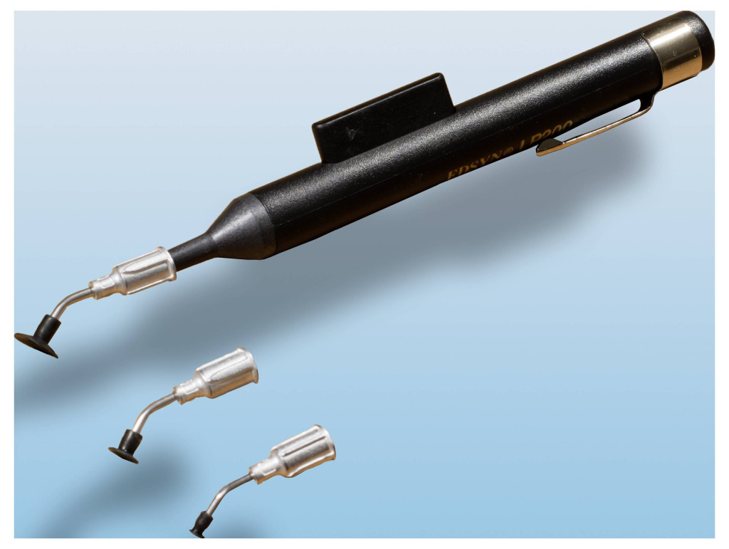 Antisztatikus vákuumcsipesz nagyon érzékeny és kis építőelemek felszippantására és elhelyezésére. Ilyen elemek az SMD-k, CMOS-ok, TTL-ek és E-Prom-ok. 3 különböző nagyságú beszívócsővel szállítjuk.