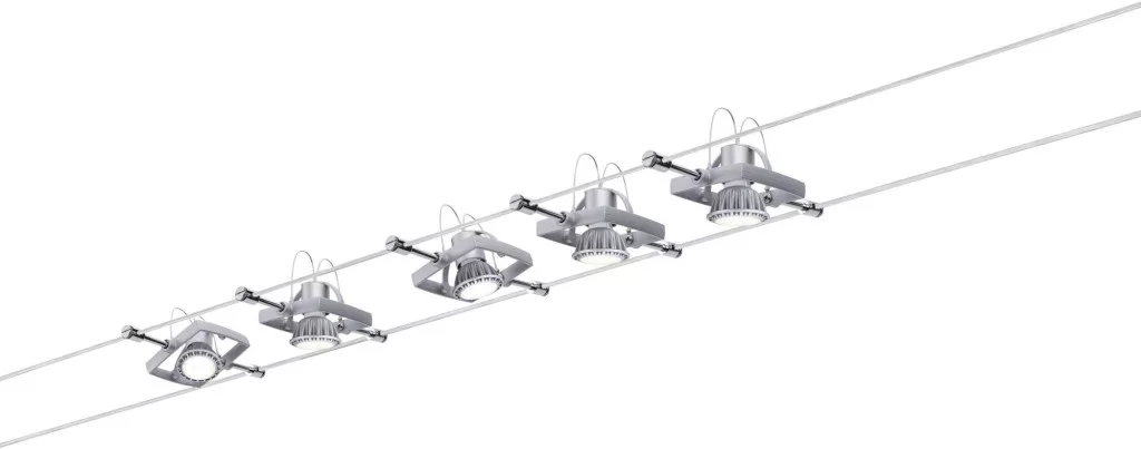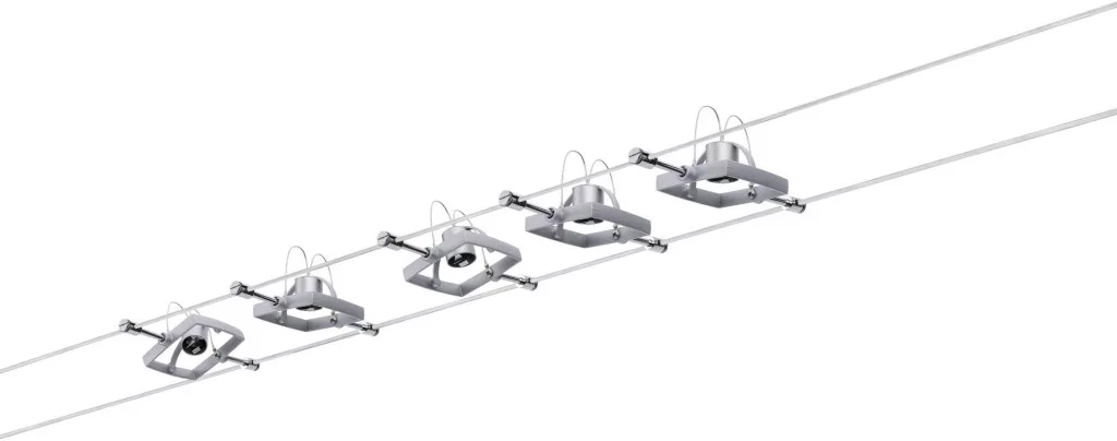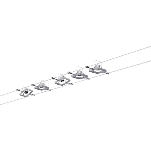 Műszaki adatok: 2021-es energiahatékonysági osztályok: n.rel. · Anyag: Fém · Foglalat: GU5.3 · Fényforrás típus: LED · Fényforrások száma: 5 · Gyártói szín: Króm (matt) · Helyiség: Nappali/étkező,Konyha,Dolgozószoba,Hálószoba · Kimeneti teljesítmény (VA): 60 VA · Kötél távolság: 16 cm · Kötélhossz: 10 m · Lámpa jellemzők: Dimmelhető,Dönthető,Falra szerelhető · Stílus: Modern/dizájn · Súly: 2704 g · Teljesítmény: 50 W · Teljesítmény fényforrásonként: 10 W · További műszaki adatok: Fesztáv: 5 m · Védelmi osztály: II · Védelmi típus: IP20 · Üzemi feszültség: 12 V