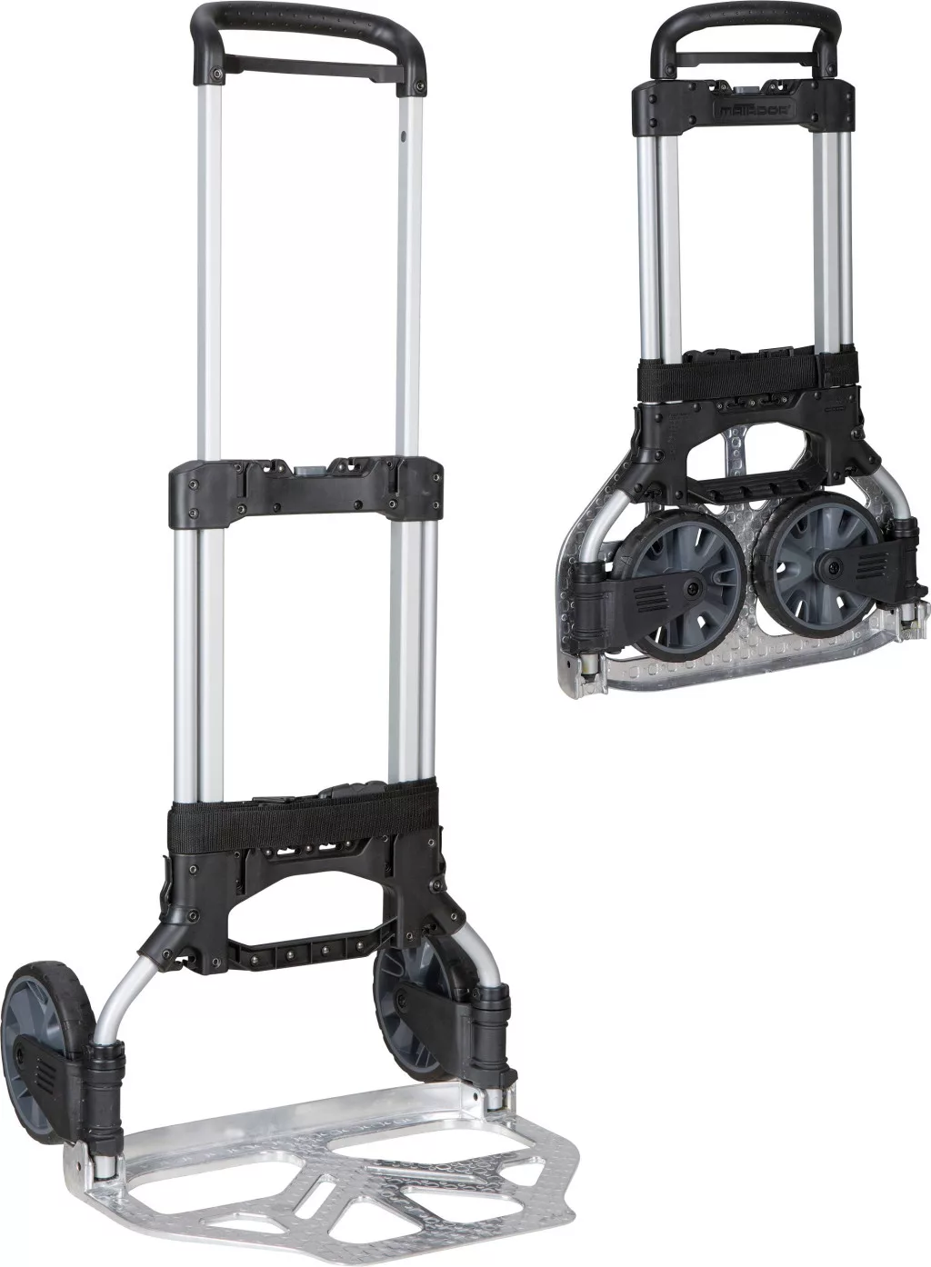 Jellemzők: Külső méretek: Szé 490 x Mé 490 x Ma 1090 mm (összecsukva SZ 490 x Mé 60 x 760 mm) · Súly 5,2 kg · 150 kg-ig terhelhető · Alumíniumból készült, kihúzható fogantyúval és két nagy görgővel, keménygumi gumiabroncsokkal.
