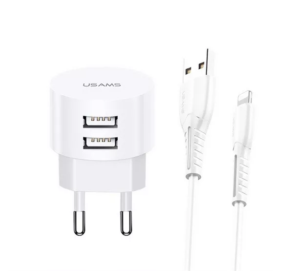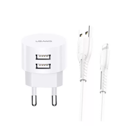 USAMS T20 hálózati töltő 2 USB aljzat 10W, gyorstöltő + lightning kábel, FEHÉR