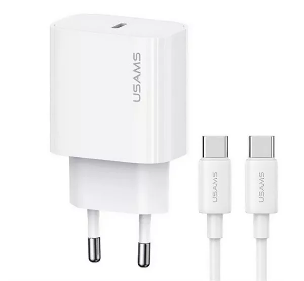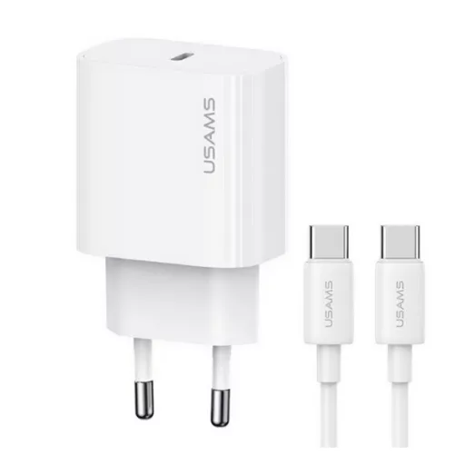 USAMS T65 hálózati töltő Type-C aljzat 20W, PD gyorstöltő + Type-C kábel, FEHÉR