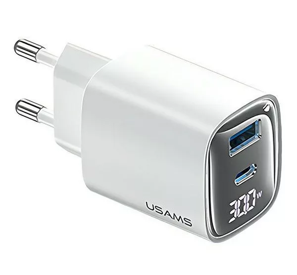 USAMS CC229 hálózati töltő USB+Type-C aljzat (30W, GaN, PD gyorstöltő, LED kijelző) FEHÉR