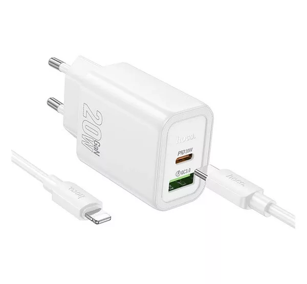 HOCO N61 hálózati töltő USB+Type-C aljzat 20W, PD gyorstöltő 3.0 + lightning kábel, FEHÉR