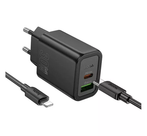 HOCO N63 hálózati töltő USB+Type-C aljzat 30W, PD gyorstöltő 3.0 + lightning kábel, FEKETE