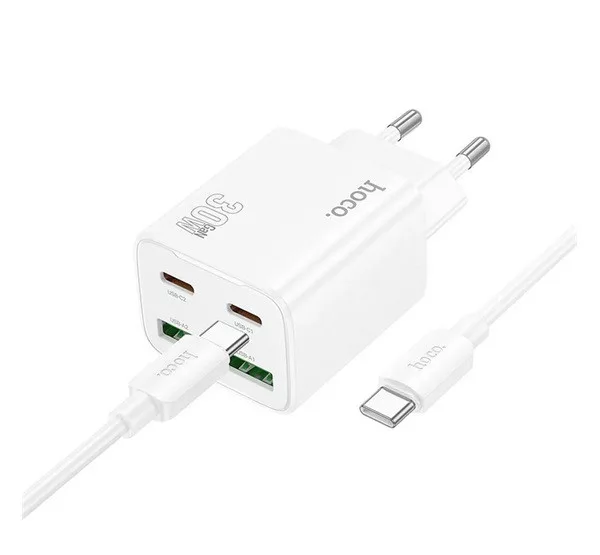 HOCO N56 hálózati töltő 2 USB+2 Type-C aljzat (30W, GaN, PD gyorstöltő 3.0 + Type-C kábel) FEHÉR