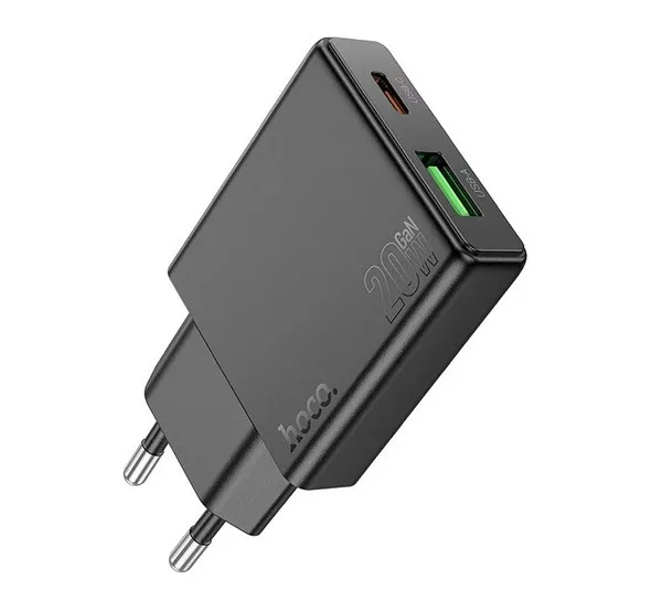 HOCO N38 hálózati töltő USB+Type-C aljzat 20W, vékony, FEKETE