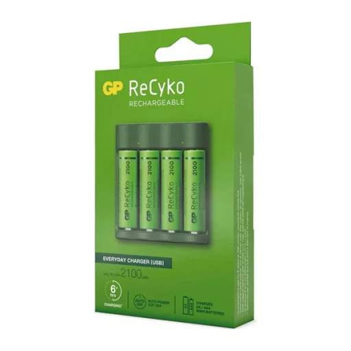 GP RECYKO akkutöltő LED jelzés, 4xAA/AAA elem kompatibilis + 4db 2100mAh AAA elem, SÖTÉTZÖLD