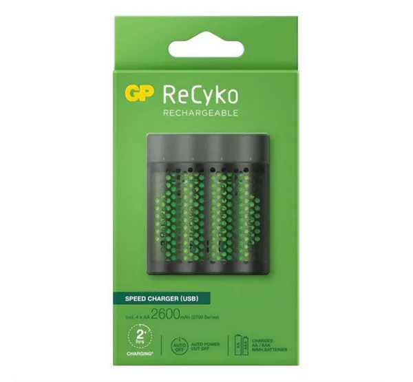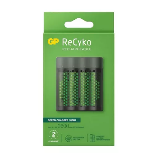 GP RECYKO akkutöltő LED jelzés, 4xAA/AAA elem kompatibilis + 4db 2700mAh AAA elem, FEKETE