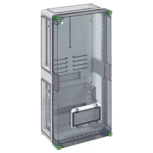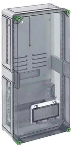Mérőház, ipari minőségű, alapkivitelben zárható, mérő tartólappal és mérő rögzítő csavarokkal, mechanikus villamosóra-mérőkhöz (indukciós mérők), elektronikus háztartási mérőkhöz BKE-A adapterrel, 4 x házcsatlakozóval (GGV), átlátszó fedéllel és további csuklós ablak