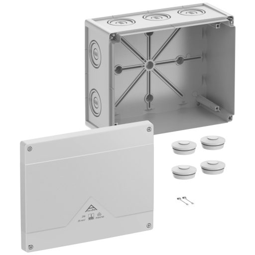 Csatlakozódoboz, IP66/IP67/IP69 védelmi osztályú, névleges keresztmetszet 25 mm², VDE (DIN EN 60670-1/-22 (VDE 0606-1/-22)), DLG (ammóniaállóság), DNV (osztály) által tanúsított : hajók és offshore rendszerek), kiütő membránok, M20/M25/M40/M50, (4 hátul, 10 oldal), belső rögzítési pontok, ipari környezetben és nem védett kültéri telepítésekhez, szürke, Ui=1000 V AC, terminálok nélkül.