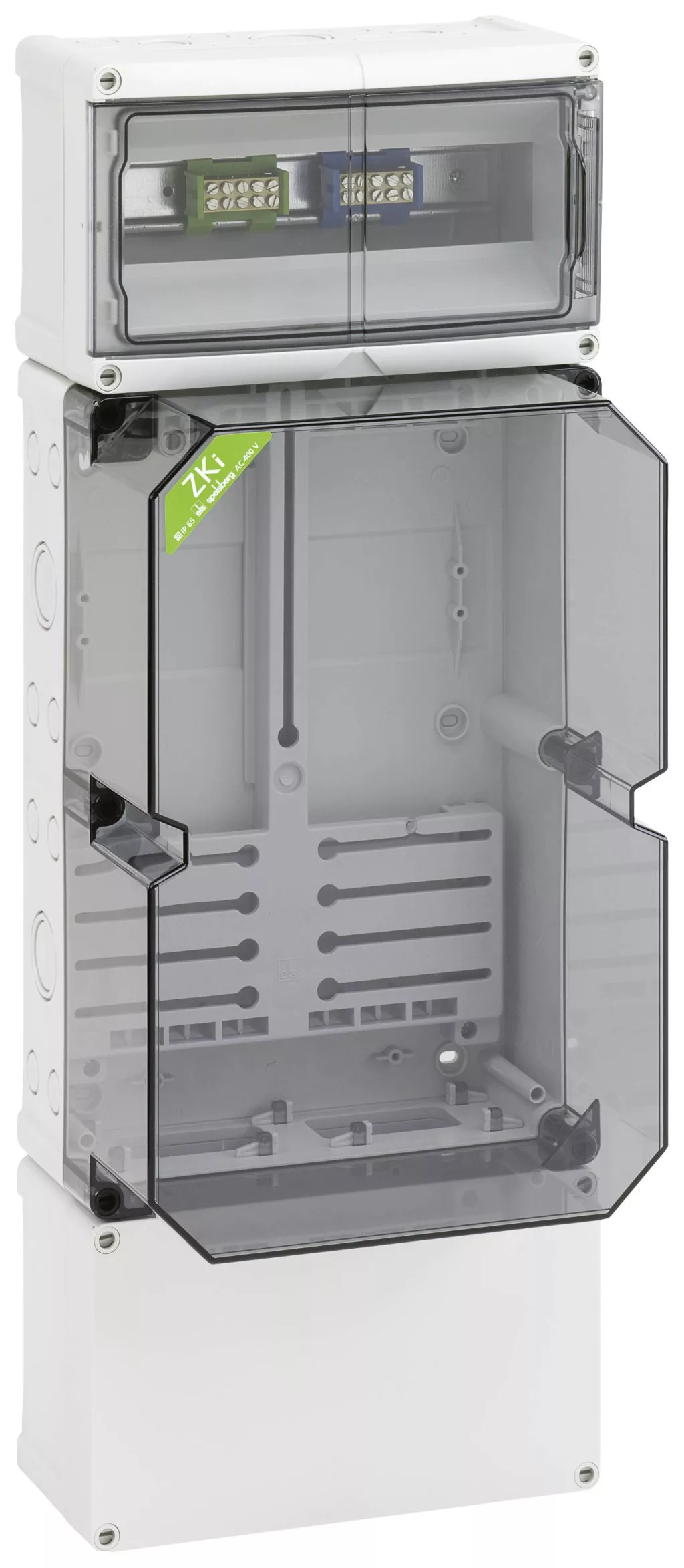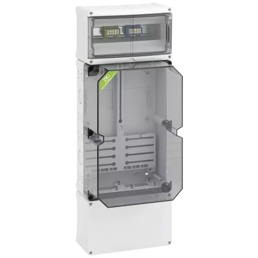 Mérőház, ipari minőségű, átlátszó fedéllel, alapkivitelben lezárható, szerelt mérőkereszttel és mérő rögzítő csavarokkal, további csatlakozási hely 150 mm alatt 35 mm-es standard sínnel, fent szokásos lezárható fogyasztói tér, 35 mm-es szabványos sínnel és PE / N kettős kapcsokkal, kettős membrán foglalattal, tömítő és szigetelő dugókkal, háromfázisú villamosóra számára