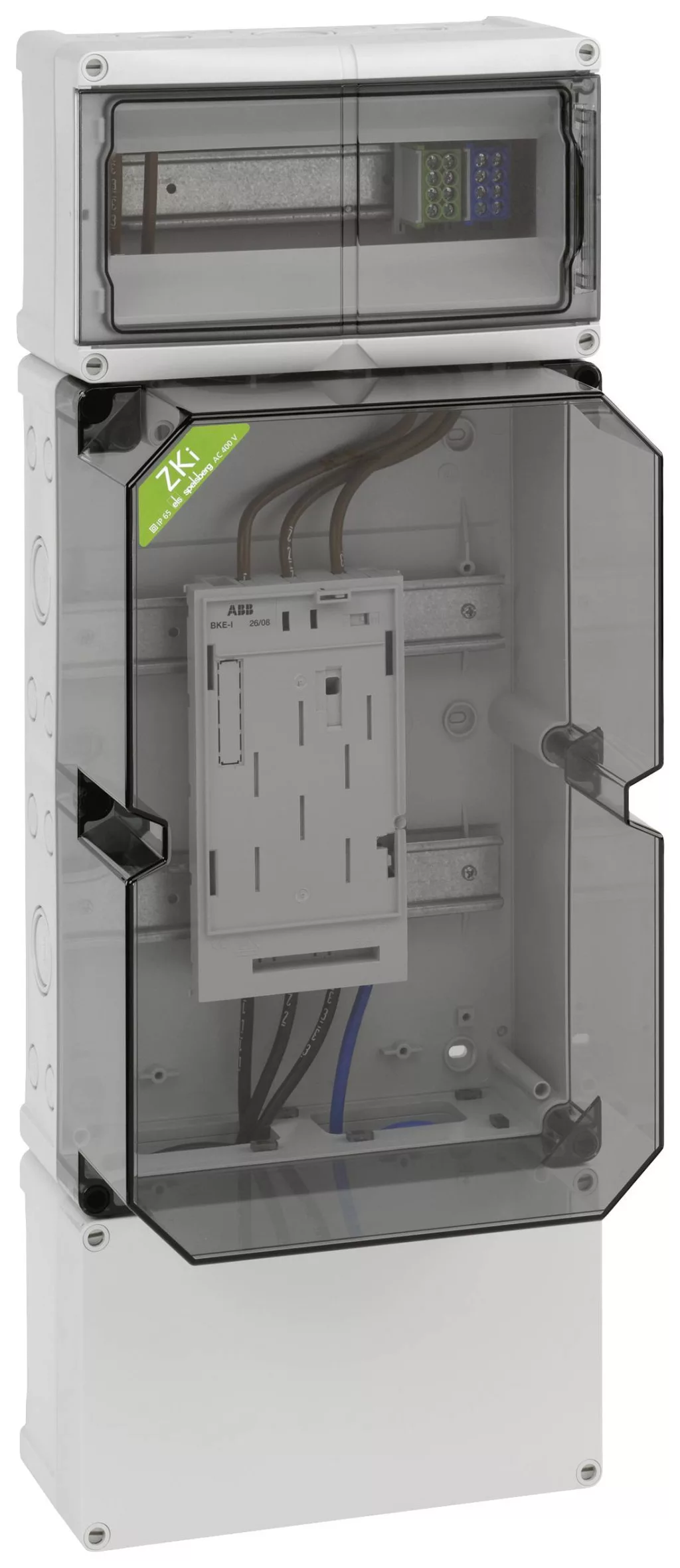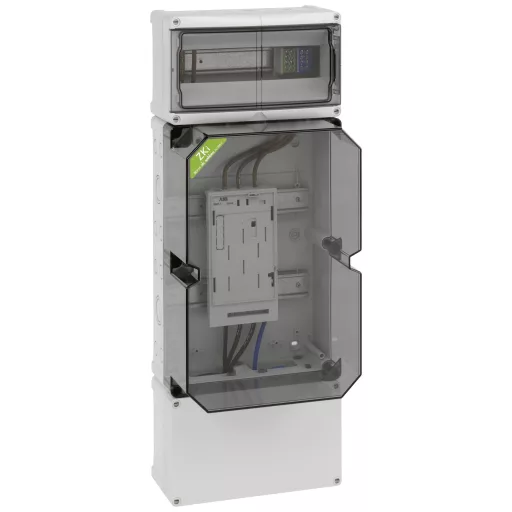 Mérőház, ipari minőségű, átlátszó fedéllel, alapértelmezés szerint zárható, beépített BKE-I-vel az elektronikus háztartási mérőórához, alapfelszerelésként lezárható felső fogyasztói szoba, 35 mm-es szabványos sínnel és PE / N kettős kapcsokkal, alatta fogyasztói szoba alapkivitelben tömíthető, 35 mm-es standard sínnel és 5 tűs HA -Clamp 25 / 16qmm-vel, kettős membránfúvókával, tömítő és szigetelő dugókkal