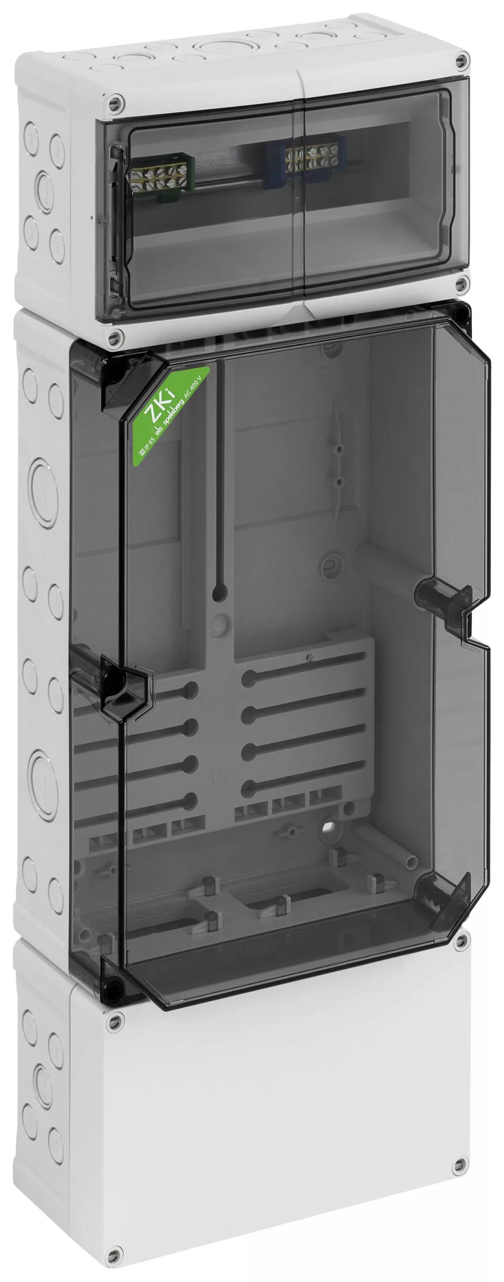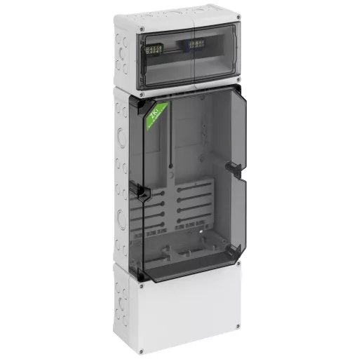 Mérőház, ipari minőségű, átlátszó fedéllel, alapkivitelben lezárható, szerelt mérőkereszttel és mérő rögzítő csavarokkal, további csatlakozási hely 150 mm alatt 35 mm-es standard sínnel, fent szokásos lezárható fogyasztói tér, 35 mm-es szabványos sínnel és PE / N kettős kapcsokkal, kettős membrán foglalattal, tömítő és szigetelő dugókkal, a DIN 43861-2 szerinti hullámvezérlő vevőkhöz, hárompontos rögzítésű mérőkhöz és max. 80 mm mélységig