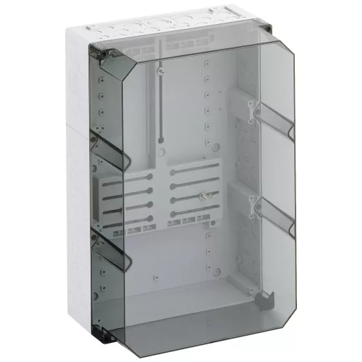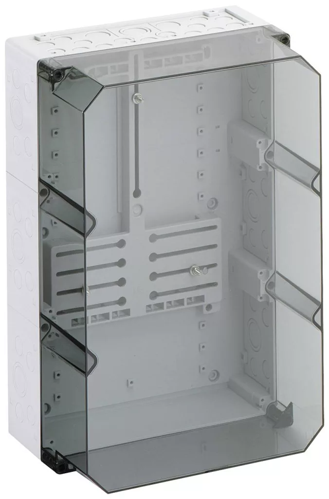 Mérőház, ipari minőség, készülék beépítési területe Mérőmező a DIN 43870-1 szerint, átlátszó fedéllel, alapértelmezés szerint zárható, háromfázisú mérőkhöz szerelt mérőkereszttel és mérő rögzítő csavarokkal, dupla membránaljzattal, tömítő és szigetelő dugókkal