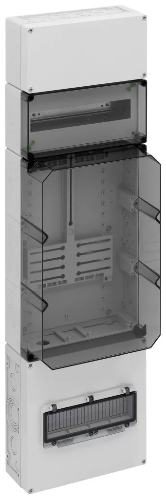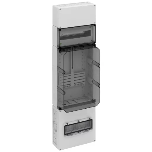Mérőelosztás többdobozos kivitelben a DIN EN 61439-2 / -3 szerint, alapkivitelben lezárható, fel nem szerelt területeken történő felületre történő felszereléshez, a DIN 43870-1 szerinti készülék szerelési felületekhez, 5 pólusú mérőkábelek. Használja a felelős hálózatüzemeltető egyedi jóváhagyása után, tömítődugókkal, zárt IP44 szellőződugókkal a páralecsapódás csökkentése érdekében, szigetelődugókkal, felső csatlakozási hellyel, 150 mm, 35 mm-es szabványos sínnel felszerelve a HA 25-53 fővezeték elágazásának befogadására ( tartozékok), hely további alkalmazásokhoz, 150mm, 12TE, 35mm-es standard sínnel felszerelve a hálózatüzemeltető, a mérőpont-üzemeltető vagy a mérőszolgáltató kiegészítő felszerelésének elhelyezésére, lezárható érintésvédő fedéllel és átlátszó fedéllel, mérőmező, 450mm, átlátszó fedél, 1 méterhez hárompontos rögzítéssel, szerelt mérőkereszttel háromfázisú mérőkhöz és mérő rögzítő csavarokkal, rögzítési méretek a DIN 43870-2 szerint, alsó csatlakozási hely, 300 mm, alapkivitelben tömíthető, 35 mm-es standarddal sín a fő megszakítóhoz, PE / N kettős kapcsokkal, 12TE csuklós ablakkal a fő megszakító nem professzionális működéséhez és további hely a Túlfeszültség-védelmi eszközök, kábelbevezetés a tömszelencén keresztül (IP65, tartozékok) vagy az M40 lépcsős csőburkolat (IP55, mellékelve)
