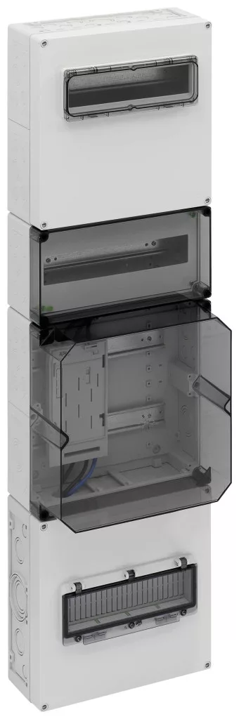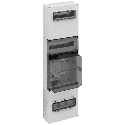 Mérőelosztás többdobozos kivitelben a DIN EN 61439-2 / -3 szerint, alapkivitelben lezárható, fel nem szerelt területeken történő felületre történő felszereléshez, a DIN 43870-1 szerinti készülék szerelési felületekhez, 5 pólusú mérőkábelek. Használja a felelős hálózatüzemeltető egyedi jóváhagyása után, tömítődugókkal, szigetelődugókkal, zárt IP44 szellőződugókkal a páralecsapódás csökkentése érdekében, a felső csatlakozási tér, 300 mm, 35 mm-es szabványos sínekkel felszerelve a HA25-53 fővonal leágazáshoz (tartozékok) ), valamint 12TE csuklós ablakkal ellátott fogyasztói helyiség moduláris eszközökhöz, beleértve a csavar nélküli PE / N rögzítő sínt 3 csavarható rögzítőponttal, 2,5-16 négyzetméter, 14 csavar nélküli szorítópont, 1,5-4qmm, hely további alkalmazásokhoz, 150mm, 12TE , 35 mm-es szabványos sínnel felszerelve a hálózatüzemeltető, a Mérési pont üzemeltetője vagy a mérőszolgáltató kiegészítő felszerelésének elhelyezéséhez, lezárható érintésvédő fedéllel és átlátszó fedéllel, méteres mezővel, 300 mm-es, átlátszó fedéllel, 1 BKE-I-vel az eHZ számára, bővíthető egy másik BKE-I által (figyelembe véve a VDE AR-N 4100 specifikációit), alsó csatlakozási terület, 300 mm, alapkivitelben lezárható, 35 mm-es szabványos sínnel Fő megszakítóhoz, PE / N kettős kivezetésekkel, 12TE csuklós ablakkal a fő megszakító nem professzionális használatához és további helyhez a túlfeszültség-védelmi eszközökhöz, kábelbemenethez kábeltömszelencén (IP65, tartozékok) vagy lépcsős M40 (IP55) , mellékelve)