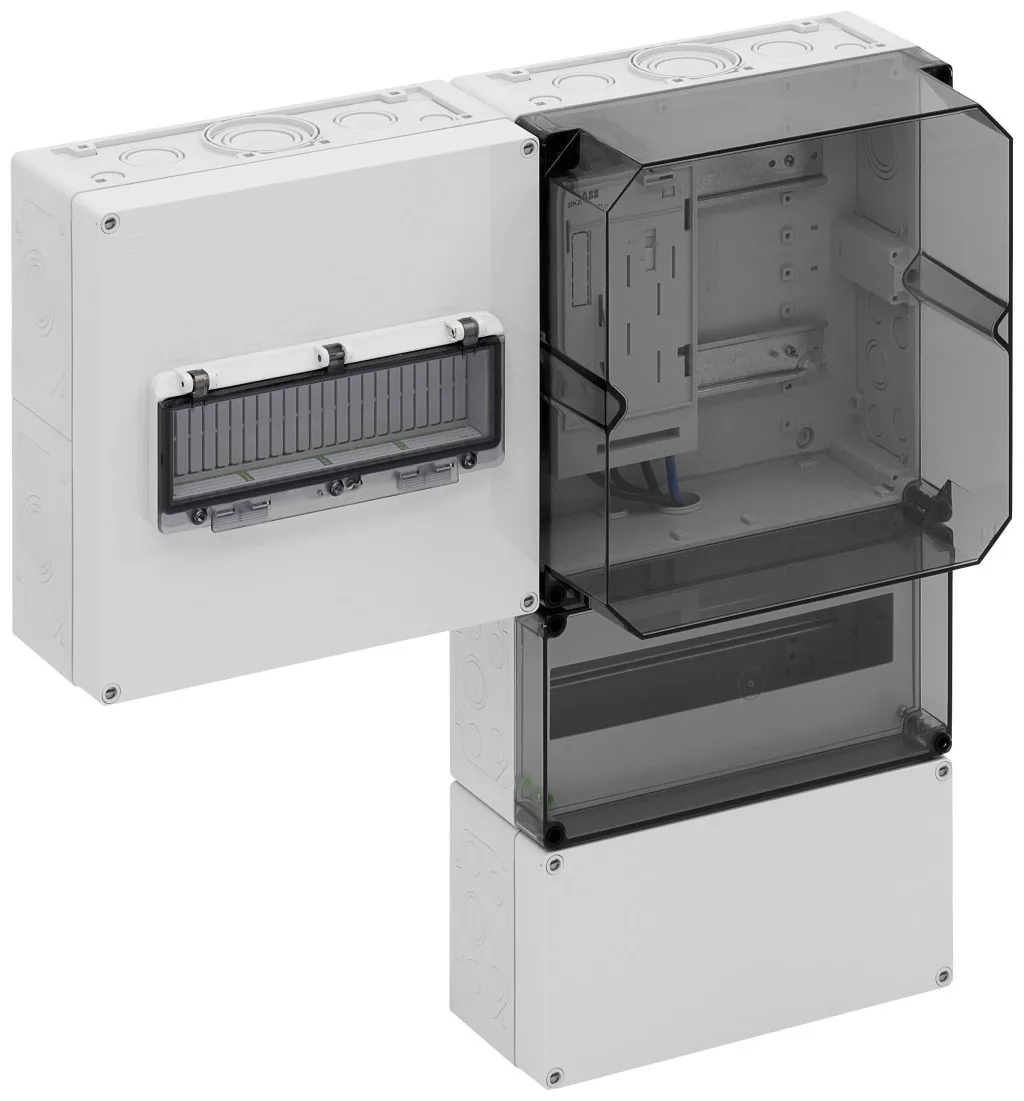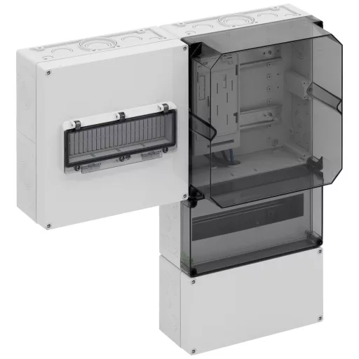 Mérőelosztás többdobozos kivitelben a DIN EN 61439-2 / -3 szerint, alapkivitelben lezárható, fel nem szerelt területeken történő felületre történő felszereléshez, a DIN 43870-1 szerinti készülék szerelési felületekhez, 5 pólusú mérőkábelek. Használja a felelős hálózatüzemeltető egyedi jóváhagyása után, tömítődugókkal, szigetelődugókkal, zárt IP44 szellőződugókkal a páralecsapódás csökkentésére, 150 mm-es felső csatlakozási térrel, 35 mm-es szabványos sínnel felszerelve, a fővezeték HA 25-53 termináljának befogadására ( tartozékok), hely további alkalmazásokhoz, 150mm, 12TE, 35mm-es standard sínnel felszerelve a hálózatüzemeltető, a mérőpont-üzemeltető vagy a mérőszolgáltató kiegészítő felszerelésének elhelyezésére, lezárható érintésvédő fedéllel és átlátszó fedéllel, mérőmező, 300mm, átlátszó fedél, 1 BKE-I-vel az eHZ-hez, bővíthető egy másik BKE-I-vel (a VDE AR-N 4100 követelményeinek megfelelően), alsó csatlakozási hely, 300 mm, alapkivitelben lezárható, 35 mm-es sínnel a fő megszakítóhoz, PE / N kettős kapcsok, 12 LE-es csuklós ablakkal a fő megszakító nem professzionális működtetéséhez és további helyhez a túlfeszültség-védelmi eszközökhöz, kábelbemenettel Kábeltömszelence (IP65, tartozékok) vagy lépcsős M40 (IP55, mellékelve)