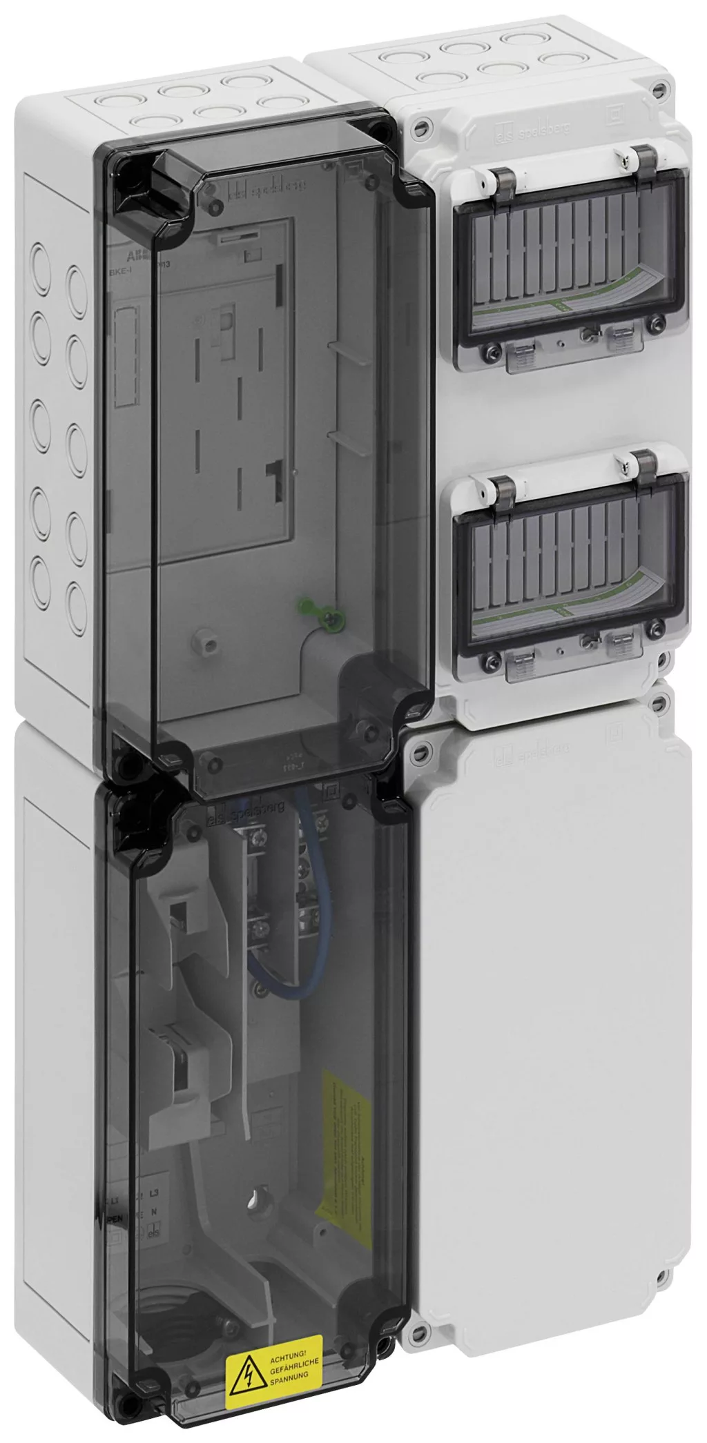 Mérőelosztó - kompakt - többdobozos kialakítás a DIN EN 61439-2 / -3 szerint, szabványosan lezárható, felületre szerelhető, közvetlen hálózati csatlakozáshoz és váltakozó áram méréséhez nem mért területeken, a felelős hálózatüzemeltető egyedi jóváhagyása után használható, zárral és szigetelő dugókkal, zárt szellőződugókkal (IPx4) a páralecsapódás csökkentése érdekében, kompakt mérőeloszlás -, amely a következőkből áll: hálózati csatlakozó doboz, ipari minőségű, 230 V AC hálózatokhoz (LN-PE / L-PEN) a VDE szerint -AR-N 4102 (házi csatlakozódoboz egyfázisú csatlakozáshoz), In = 25 A, Imax = 63 A, 1x NH00 biztosítékkal és PE / N csatlakozóval ellátva, prizmás kivezetéssel, valamint parkoló rekesszel a nem használt vezetékek számára, mérőóra mező, átlátszó fedéllel, 1 BKE-I-vel váltakozó áramú eHZ-hez, mérőhuzalozással, géppel, 2 csuklós ablakkal moduláris eszközökhöz (6TE), PE / N szorítósínnel, üres ház egyedi tágításhoz standard sínekkel vagy szerelőlap