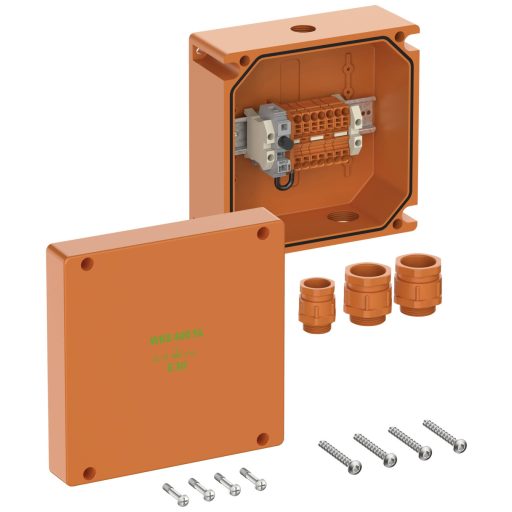 Csatlakozódoboz, IP66 védelmi osztályú, Ui=450V AC, belső menet, M25/M32, (3 oldalirányban), külső rögzítési pontok, elektromos funkció karbantartással E30 DIN 4102 12. rész szerint, VDE szerint tesztelve (DIN EN 61439-). 1/-2 (VDE 0660 -600-1/-2)), Wago TopJobS csavar nélküli sorkapcsokkal, ház halogénmentes speciális duroplasztból