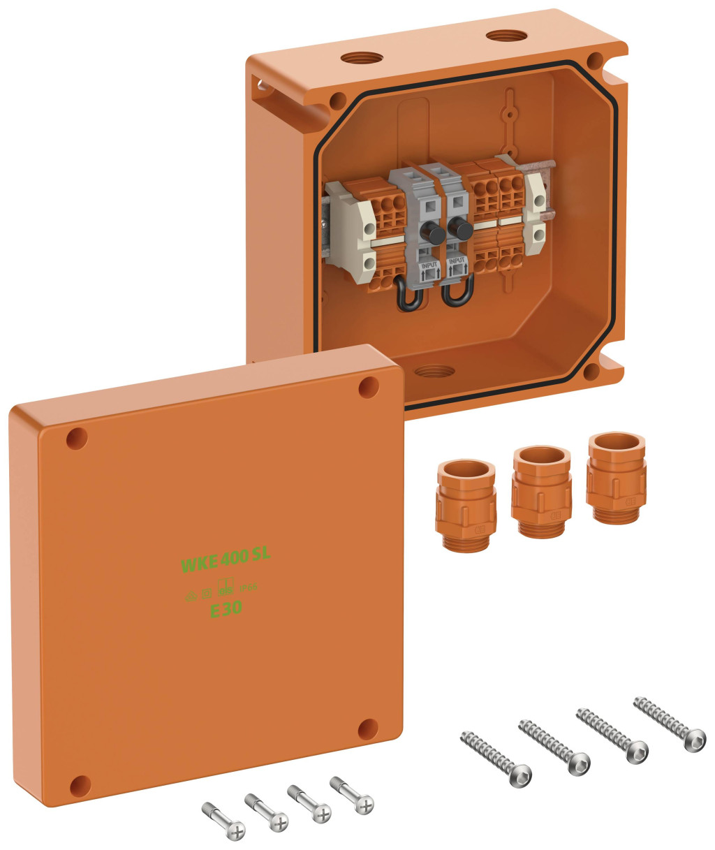Kábelcsatlakozó doboz, IP66 védelmi osztályú, Ui=450V AC, belső menet, M25, (3 oldalirányban), külső rögzítési pontok, elektromos funkció karbantartással E30 a DIN 4102 12. rész szerint, VDE szerint tesztelve (DIN EN 61439-1) /-2 (VDE 0660-600 -1/-2)), Wago TopJobS csavar nélküli sorkapcsokkal, ház halogénmentes speciális duroplasztból