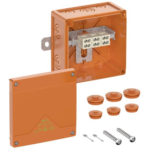 Kábelcsatlakozó és csatlakozódoboz IP66-val, az EN 60670 és az IEC 62208 szerint tanúsítva, elektromos funkció integritással E30-E90 a DIN 4102 12. része szerint Halogénmentes ház speciális hőre lágyuló műanyagból, magas hőmérsékletnek ellenálló speciális kerámiákból készült sorkapcsok, a csatlakozótartó szabadon elhelyezhető, gyors összeszerelés külső rögzítő hevedereken keresztül, csatlakozódoboz 3-pólusú 1 -10qmm, elosztódoboz 3-pólusú 1- 10qmm, befogható vezetők száma pólusonként: 20 x 1q / 16 x 1,5q / 12 x 2,5q / 8 x 4q / 4 x 6q / 4 x 10q