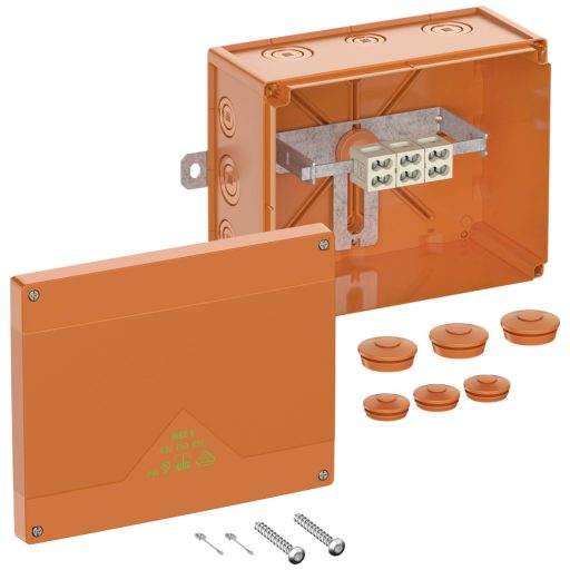 Kábelcsatlakozó és csatlakozódoboz IP66-val, az EN 60670 és az IEC 62208 szerint tanúsítva, elektromos funkció integritással E30-E90 a DIN 4102 12. része szerint Halogénmentes ház speciális hőre lágyuló műanyagból, sorkapcsok magas hőmérsékletnek ellenálló speciális kerámiákból, a sorkapocs tartója szabadon elhelyezhető, gyors összeszerelés külső rögzítő hevedereken keresztül, csatlakozódoboz 3-tűs 1,5-16qmm, csatlakozódoboz 3-tűs 1,5- 16qmm, befogható vezetők száma pólusonként: 20 x 1,5qmm / 16 x 2,5q / 12 x 4q / 8 x 6q / 4 x 10q / 4 x 16q