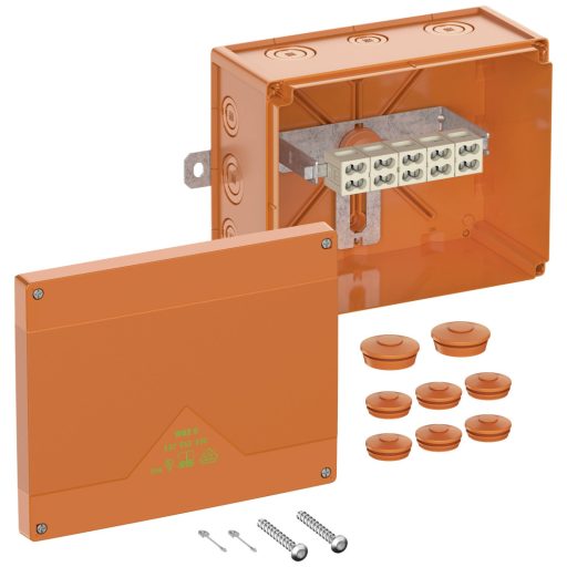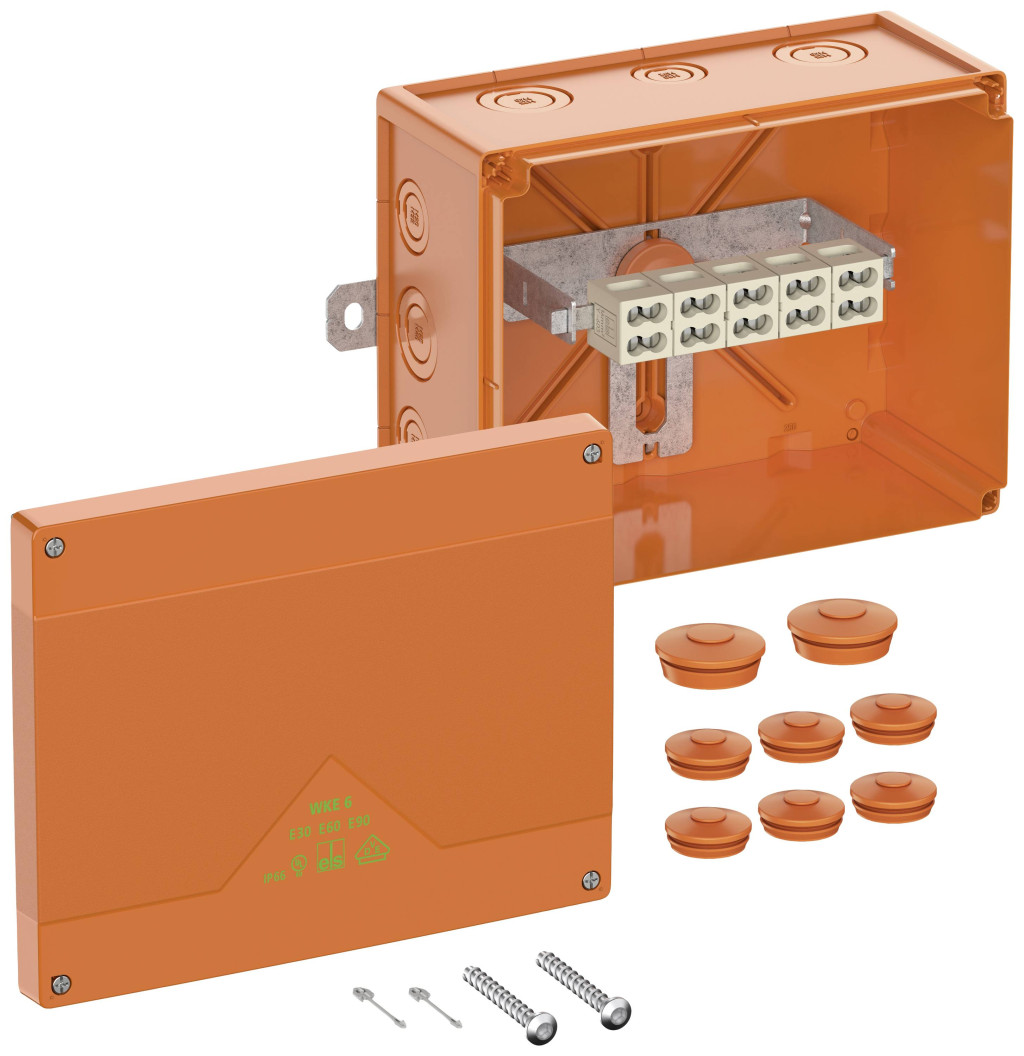 Kábelcsatlakozó és csatlakozódoboz IP66-val, az EN 60670 és az IEC 62208 szerint tanúsítva, elektromos funkció integritással E30-E90 a DIN 4102 12. része szerint Halogénmentes ház speciális hőre lágyuló műanyagból, sorkapcsok magas hőmérsékletnek ellenálló speciális kerámiákból, a csatlakozótartó szabadon elhelyezhető, gyors összeszerelés külső rögzítő hevedereken keresztül, csatlakozódoboz 5-tűs 1,5-16qmm, csatlakozódoboz 5-tűs 1,5- 16qmm, befogható vezetők száma pólusonként: 20 x 1,5qmm / 16 x 2,5q / 12 x 4q / 8 x 6q / 4 x 10q / 4 x 16q