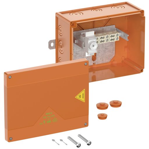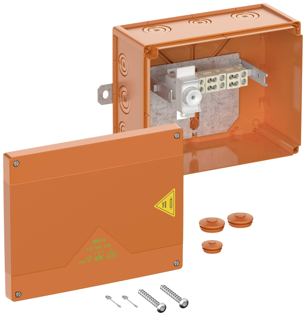 Kábelcsatlakozó és csatlakozódoboz IP66 tanúsítvánnyal az EN 61439 és az IEC 62208 szerint, E30-E90 elektromos működési integritással a DIN 4102 12. része szerint. Halogénmentes ház speciális hőre lágyuló műanyagból, kivezetések magas hőmérsékletnek ellenálló speciális kerámiából, a csatlakozótartó szabadon elhelyezhető, gyors összeszerelés külső rögzítő hevedereken keresztül, csatlakozódoboz 5 tűs 1,5-10 nm, csatlakozódoboz 3 tűs 1,5 -4 nm, biztosíték a csomópontban 1 x D01 foglalat (betét nélkül), befogható vezetők száma rögzítési pontonként 4 x 1,5q / 3 x 2,5q / 2 x 4q / 1 x 6q / 1 x 10q