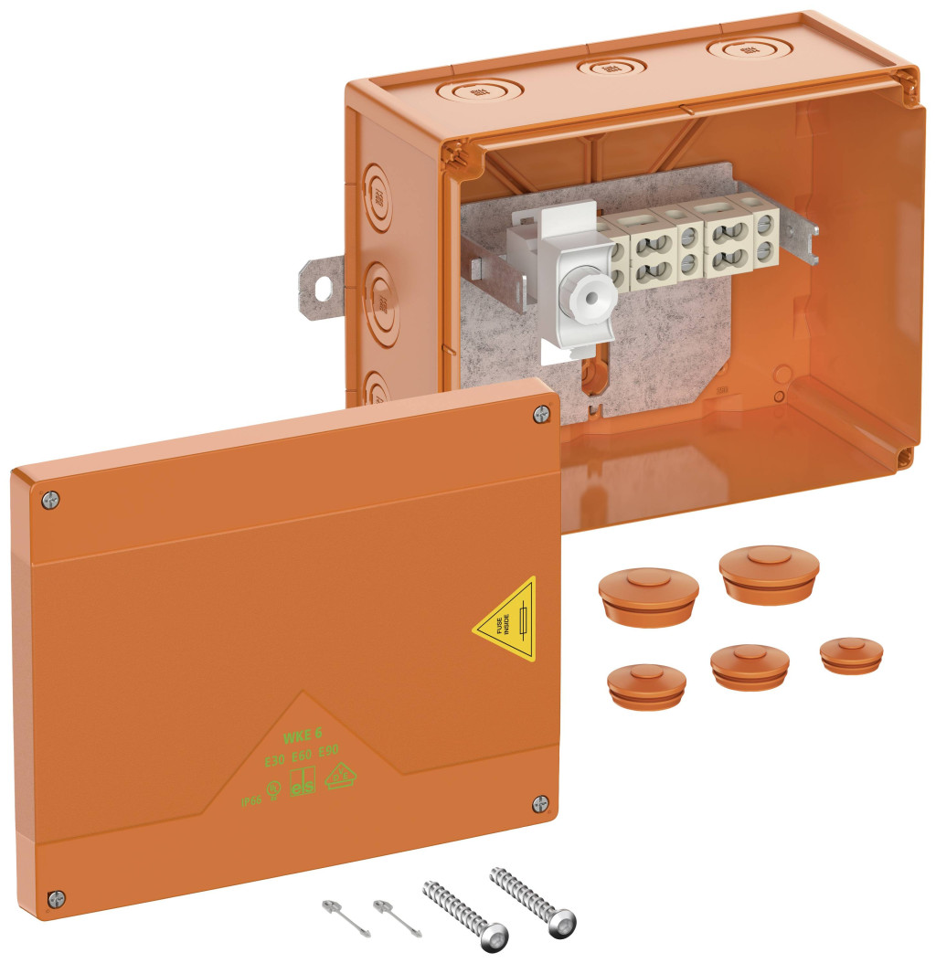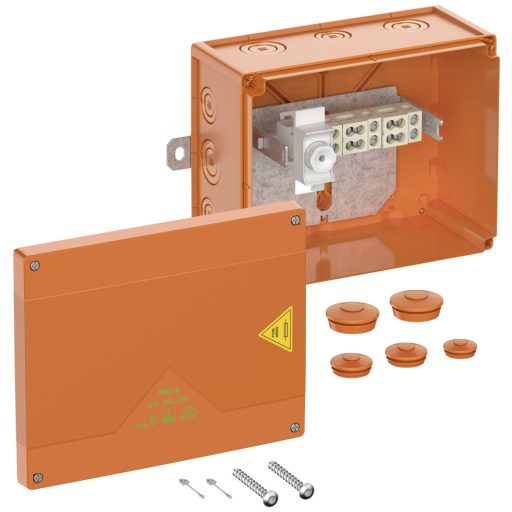 Kábelcsatlakozó és csatlakozódoboz IP66 tanúsítvánnyal az EN 61439 és az IEC 62208 szerint, E30-E90 elektromos működési integritással a DIN 4102 12. része szerint. Halogénmentes ház speciális hőre lágyuló műanyagból, kivezetések magas hőmérsékletnek ellenálló speciális kerámiából, a csatlakozótartó szabadon elhelyezhető, gyors összeszerelés külső rögzítő hevederekkel, csatlakozódoboz 5 tűs 1,5-16 nm, elosztódoboz 3 tűs 1,5 -4 nm, biztosíték a csomópontban 1 x D01 foglalat (betét nélkül), befogható vezetők száma rögzítési pontonként 5 x 1,5q / 4 x 2,5q / 2 x 4q / 2 x 6q / 1 x 10q / 1 x 16q