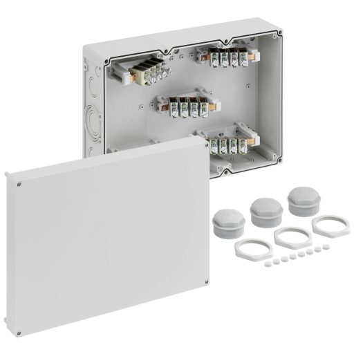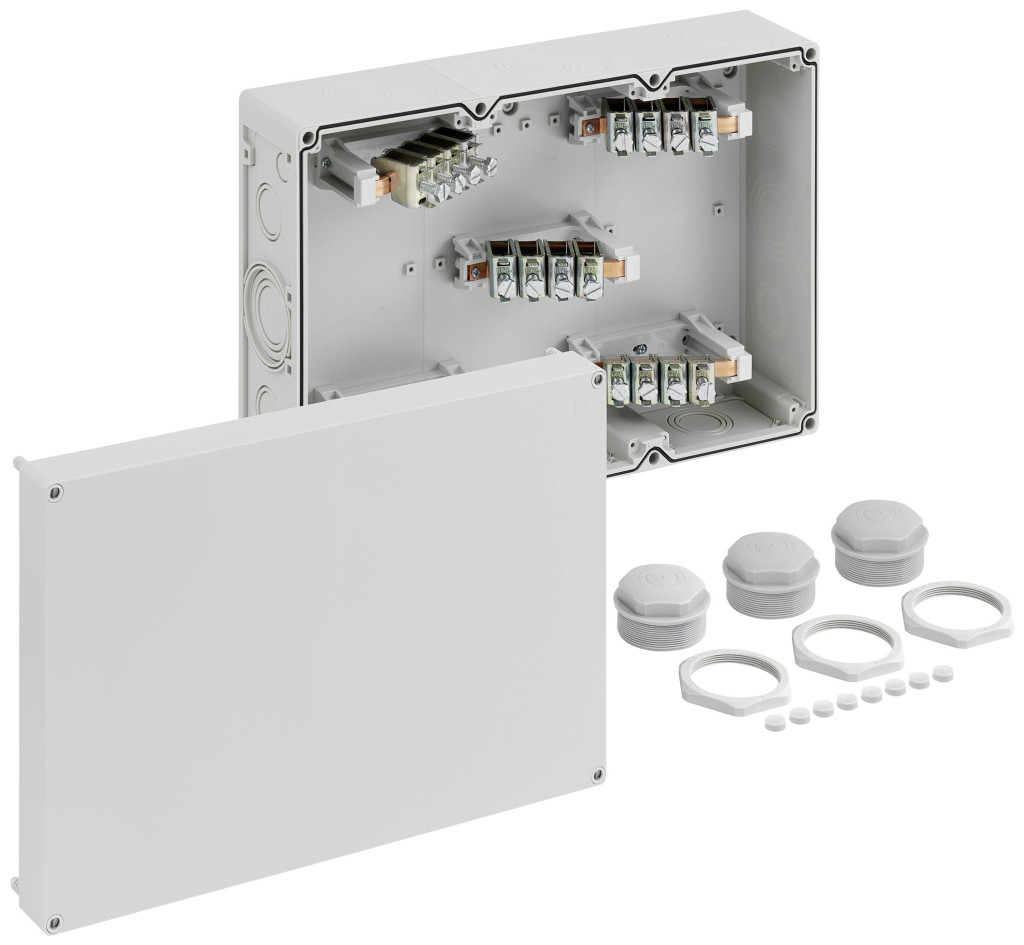 Elosztódoboz, Ui = 690V, 3 tömszelencével és ellenanyával, IP54, M63, 24-43mm tömítési tartomány, alapkivitelben zárható, szürke, 5 sorkapocs 4 x 70qmm, 16-70q