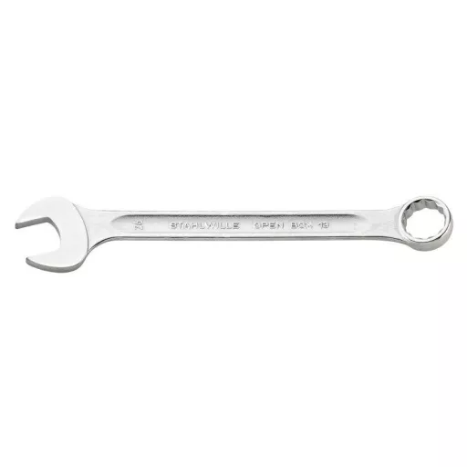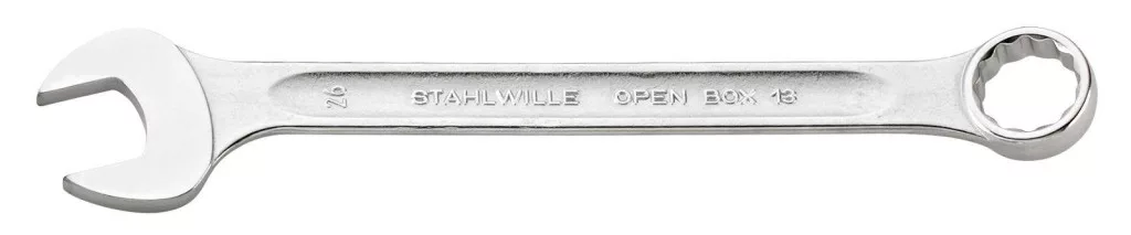 DIN 3113 Form A / ISO 7738 Form A · Száj oldala egyenes, gyűrű oldala 15°-os szögben · Stabil, vékony és könnyű intelligens konstrukció · Nagy hajlítószilárdság a dupla T profilnak köszönhetően · Tapadós, bőrbarát felület a STAHLWILLE kerek felületnek köszönhetően · Rendkívül rugalmas, rendkívül tartós · Kovácsolt, edzett és olajfürdőben hűtött csepp · Króm ötvözött acél, krómozott