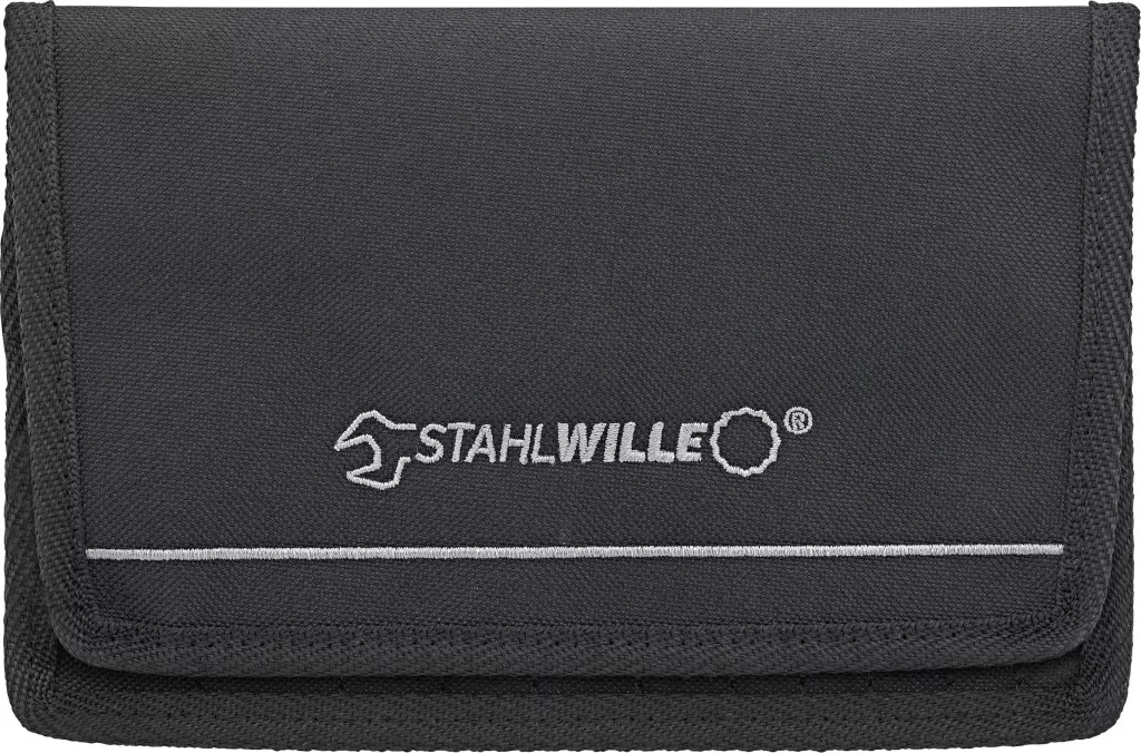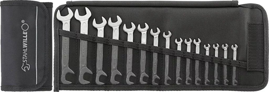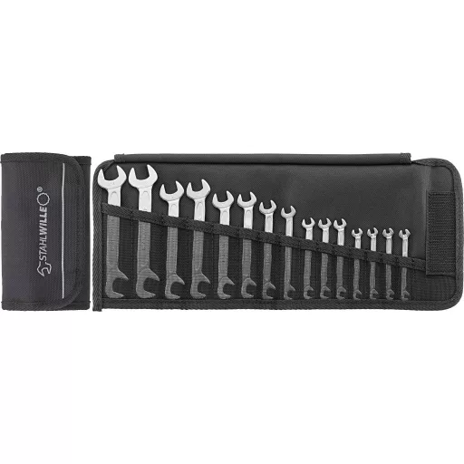 Németországban készült - STAHLWILLE ELECTRIC dupla villáskulcs-készlet robusztus, feltekerhető tokban, 15 darabos, 3,2-14 mm, krómötvözet acél, krómozott.