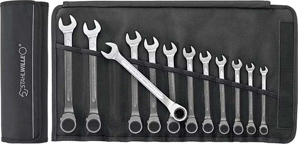 A racsnis csillagkulcskészlet a leggyakoribb villáskulcsméreteket tartalmazza 8-tól 19 mm-ig, így széles körű alkalmazási lehetőségeket kínál. A pofanyílás 15°-ban ferde, ami lehetővé teszi, hogy pontosan a csavarokra feküdjön, és így optimális erőátvitelt biztosítson. Az integrált, finomfogazású, alacsony visszatérési szögű racsni lehetővé teszi a csavarok gyors és hatékony meghúzását a kulcs eltávolítása nélkül.
