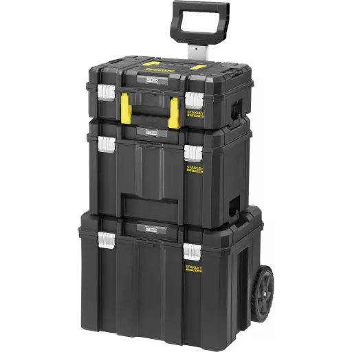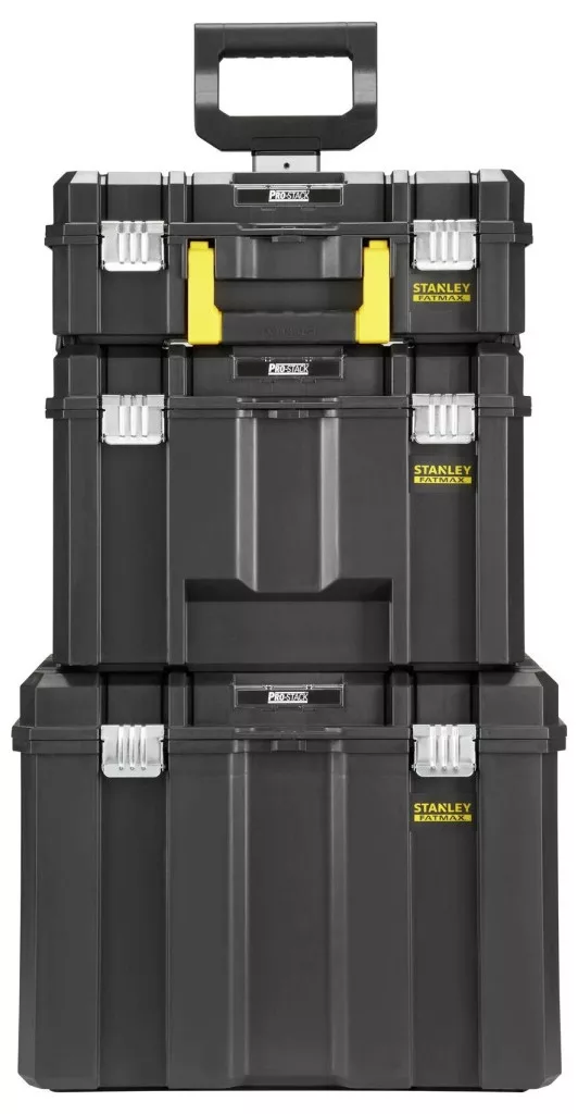 Három PRO-STACK™ szerszámosláda kombinációja fémzárral: PRO-STACK™ II szerszámosláda (habbetét nélkül), PRO-STACK™ VI és a PRO-STACK™ mobil szerszámosláda robusztus, nagy teherbírású kerekekkel és teleszkópos fogantyúval