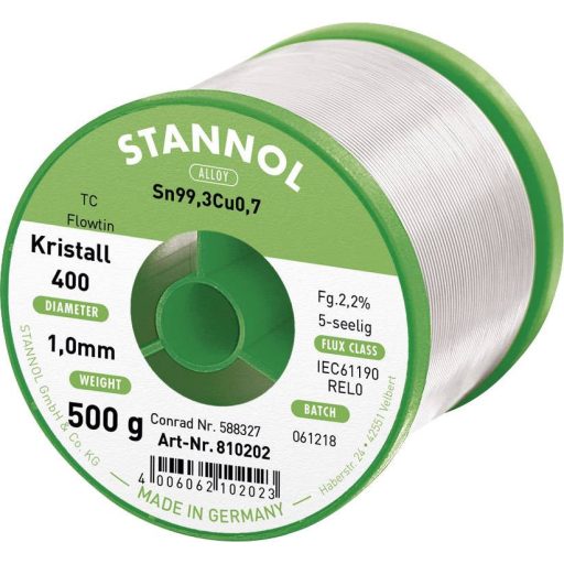 Műszaki adatok: Forrasztóón típus: Forrasztóón, ólommentes · Huzal átmérő: 1.0 mm · Kivitel: Tekercs · Kivitel (forrasztóón): Tekercs · Súly: 500 g · Ötvözet: Sn99.3Cu0.7