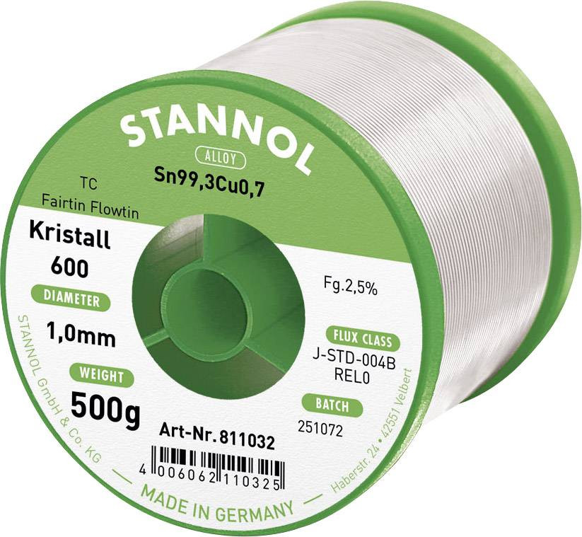 Stannol puha forrasztóhuzal, Kristall 600, Flowtin TC Sn99Cu1 ötvözetben, 2,5% fluxus-tartalommal, 1,0 mm átmérőjű, 500 g-os orsón