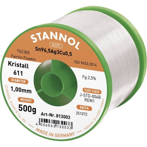 Stannol puha forrasztóhuzal, Kristall 611, Flowtin TSC305 ötvözetben, 2,5% fluxustartalommal, 1,0 mm átmérőjű, 500 g-os orsón