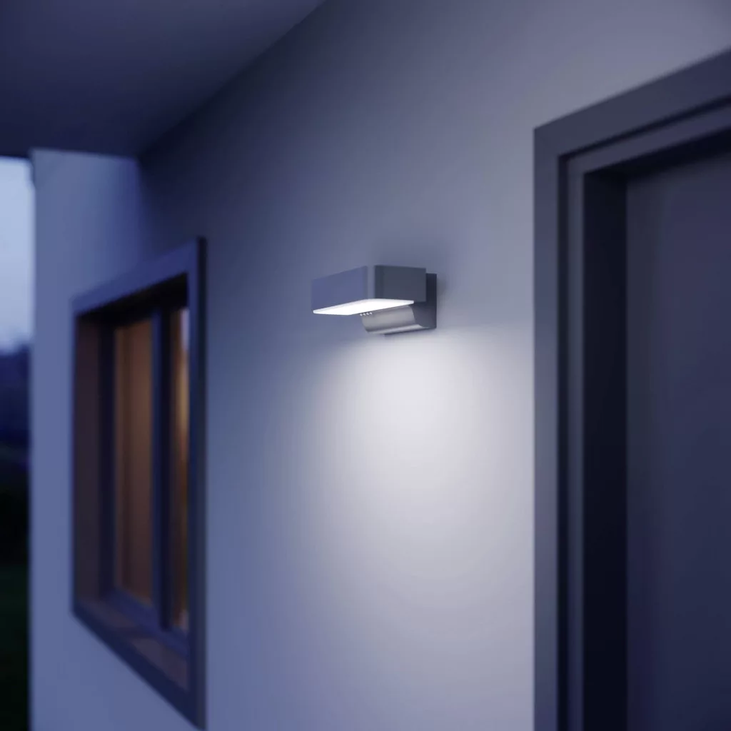 Műszaki adatok: 2021-es energiahatékonysági osztályok: n.rel. · Anyag: Alumínium, Műanyag · Beállítható világítási időtartam, max.: 60 perc · Beállítható világítási időtartam, min.: 5 mp · Fényforrások száma: 1 · Fényforrással: Igen · Fényszín: 3000 K · Fényáram összesen: 466 lm · Fényáram/fényforrás (lumen): 466 lm · Gyártói szín: Antracit · Helyiség: Terasz/ülősarok, Járda megvilágítás, Hangulatos kertvilágítás, Ház/garázs · Kivitel (lámpa): Derékszögű · Lámpa jellemzők: Mozgásérzékelővel, Alkonykapcsoló funkcióval · Méret, hossz: 145 mm · Méret, magasság: 88 mm · Méret, szélesség: 230 mm · Teljesítmény: 7.5 W · Védelmi osztály: II · Védelmi típus: IK03, IP44 · Vízszintes látószög: 160 ° · Észlelési szélesség, max.: 5 m · Üzemi feszültség: 230 V