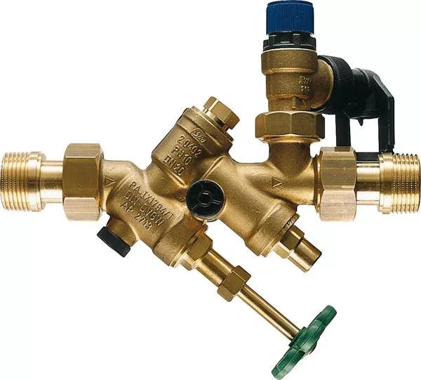 G 3/4 biztonsági csoport elektromos és kombinált tárolótartályokhoz 1000 literig. Tartalom. Standard 0,6 MPa (6 bar) biztonsági szeleppel 0,6 MPa (6 bar) megengedett üzemi nyomású tárolótartályokhoz. Zárt cserepatron membrán biztonsági szelephez, 1,0 MPa (10 bar). A DIN 1988 szerint alapfelszereltségben elzárószeleppel, visszacsapó szeleppel és vizsgálóberendezéssel (2. Elzárószelepek) Nyomásmérő csatlakozó, membrán biztonsági szelep és ürítőtölcsér. A biztonsági szelep leeresztő tölcsérébe egy csőmegszakító van beépítve, amely megakadályozza a leeresztő víz visszaszívását. A biztonsági szelep forgatható és csavaros csatlakozóval cserélhető, hogy alkalmazkodjon a különböző telepítési feltételekhez. A biztonsági csoport lehetővé teszi a vízszintes és függőleges csövek sarokba és egyenes formába történő beépítését. Függőleges vonalakban a biztonsági csoport csak alulról felfelé haladó áramlás irányában szerelhető fel.