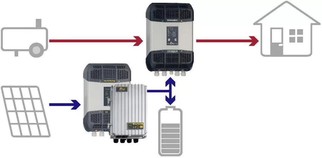 Szolárellátás BTS-hez inverterrel / Xtender akkumulátortöltővelA hibrid megoldás jelentősen csökkentheti a dízelfogyasztást és jelentősen javíthatja a generátor hatékonyságát. A napenergia feleslegét az inverter segítségével más célokra felhasználhatjuk. Az akkumulátor felügyelete szintén integrált, és lehetővé teszi az inverter kimenetének kikapcsolását az akkumulátor feszültségének függvényében. Az üzemeltetési költségek csökkentése és a hosszabb élettartam.