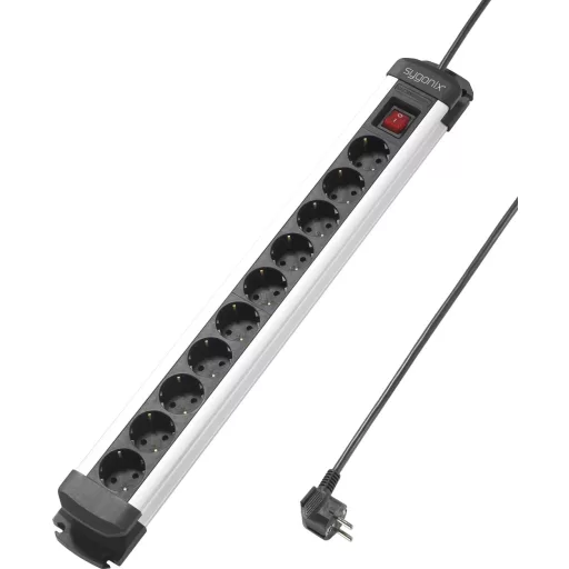 Műszaki adatok: Alkalmazási terület: Beltér · Anyag: Alumínium · Csatlakozási teljesítmény: 3680 W · Dugaljak száma: 10 · Hálózati csatlakozó típus: Védőérintkezős · Hálózati elosztó jellemzők: Kapcsolóval · Kábel típus DIN/VDE szerint: H05VV-F 3G 1,5 mm² · Kábelhossz: 1.40 m · Méret, hossz: 605 mm · Méret, magasság: 47 mm · Méret, szélesség: 74 mm · Szín: Fekete,Ezüst · Termék típus: Elosztó kapcsolóval · Üzemi feszültség: 230 V/AC