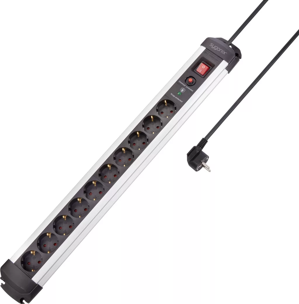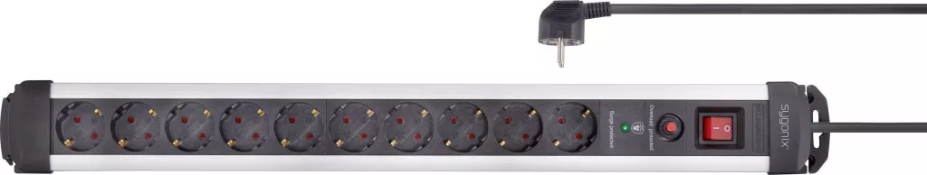 Technical specifications: Product.PlasticfreePackaging: #####PlastikfreieVerpackung · Alkalmazási terület: Beltér · Anyag: Alumínium,Műanyag · Dugaljak száma: 10 · Hálózati csatlakozó típus: Védőérintkezős · Hálózati elosztó jellemzők: Kapcsolóval,Túlfeszültség elleni védelem · Kábel típus DIN/VDE szerint: H05VV-F 3G 1,5 mm² · Kábelhossz: 1.40 m · Méret, hossz: 673 mm · Méret, magasság: 47 mm · Méret, szélesség: 74 mm · Szerelési mód: Szerelési lyukak · Szín: Ezüst,Fekete · További műszaki adatok: Túlterhelés elleni védelemmel · Túlfeszültség elleni védelem: Dugalj · Üzemi feszültség: 230 V/AC