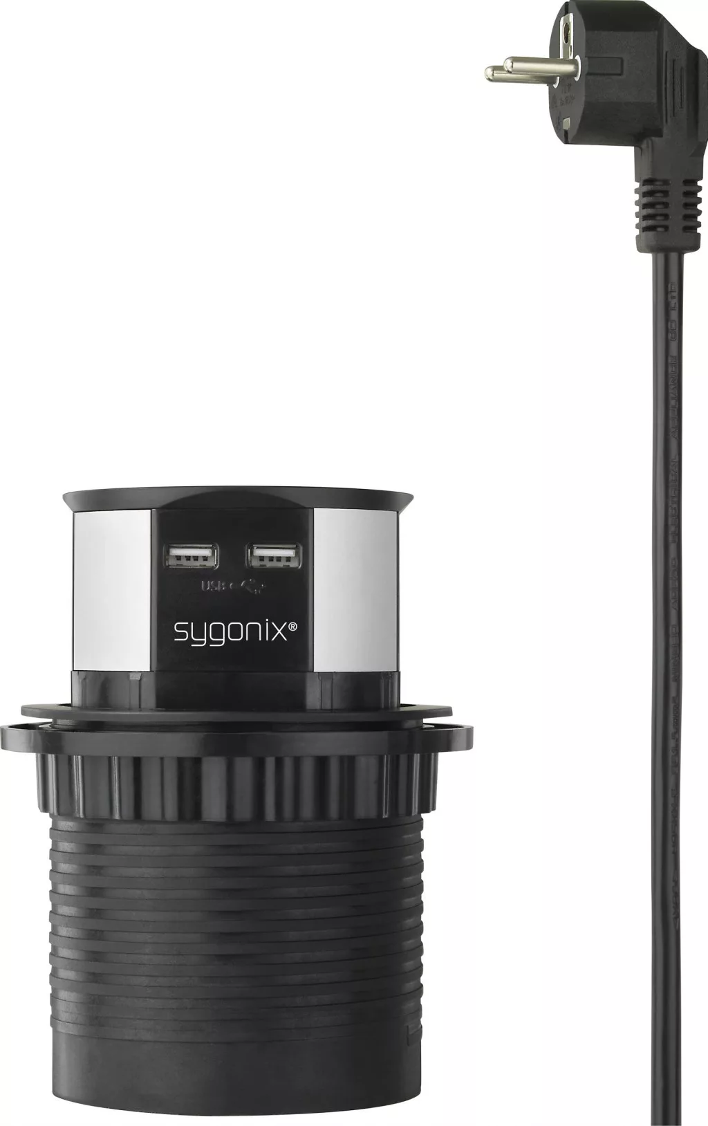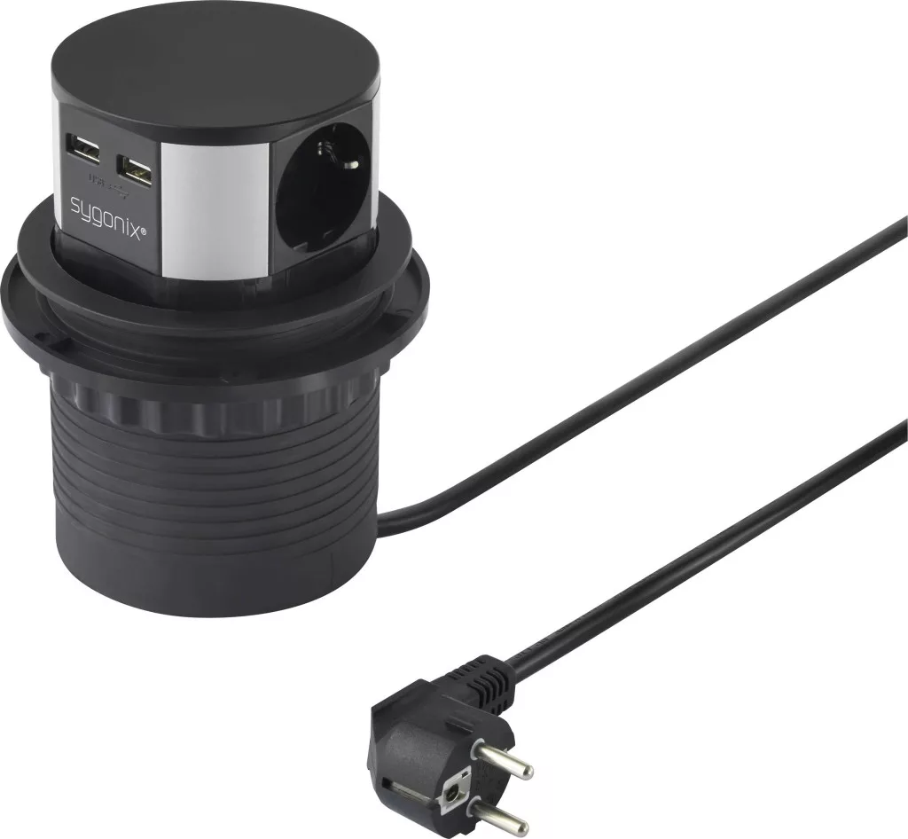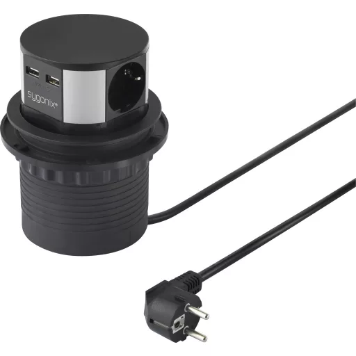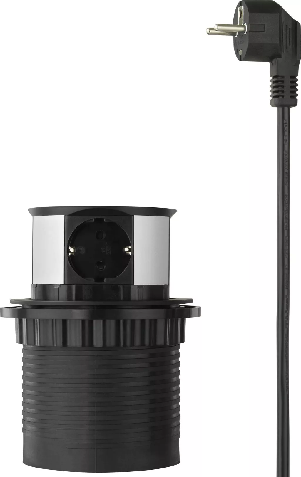 Műszaki adatok: Alkalmazás helye: Beltér · Anyag: Műanyag, Alumínium · Dugaljak száma: 3 · Gyártói szín: Fekete, Ezüst · Hálózati csatlakozó típus: Védőérintkezős · Hálózati elosztó jellemzők: USB-vel, Süllyeszthető, Gyermekvédelem · Kábel típus DIN/VDE szerint: H05VV-F 3G 1,5 mm² · Kábelhossz: 1.50 m · Méret, magasság: 159 mm · Műanyagmentes csomagolás: Műanyagmentes csomagolás · Szerelési mód: Beépíthető, Asztali · Átmérő: 128 mm · Üzemi feszültség: 230 V/AC