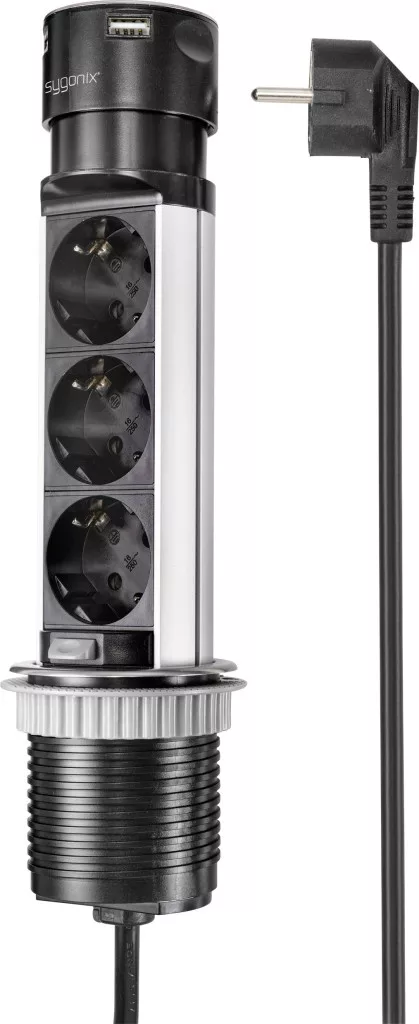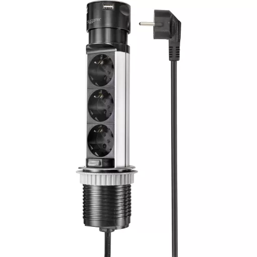 Technical specifications: Product.PlasticfreePackaging: #####PlastikfreieVerpackung · Alkalmazási terület: Beltér · Anyag: Nemesacél,Műanyag · Dugaljak száma: 3 · Hálózati csatlakozó típus: Védőérintkezős · Hálózati elosztó jellemzők: USB-vel,Süllyeszthető,Gyermekvédelem · Kábel típus DIN/VDE szerint: H05VV-F 3G 1,5 mm² · Kábelhossz: 1.50 m · Méret, hossz: 283 mm · Szerelési mód: Asztali,Beépíthető · Szín: Fekete,Nemesacél · További műszaki adatok: USB-A: 5V/DC 2,4A, 12W max.