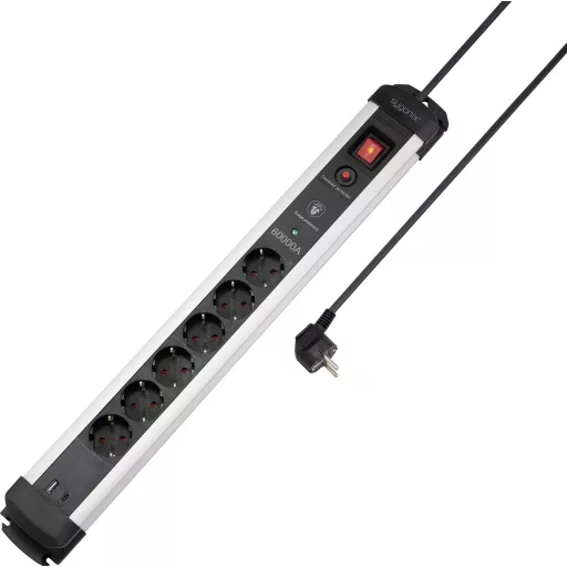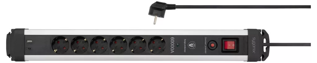 Technical specifications: Product.PlasticfreePackaging: #####PlastikfreieVerpackung · Alkalmazási terület: Beltér · Anyag: Alumínium · Dugaljak száma: 6 · Hálózati csatlakozó típus: Védőérintkezős · Hálózati elosztó jellemzők: Kapcsolóval,USB-vel,#####mit USB-C®,Túlfeszültség elleni védelem · Kivitel: USB-A: 5 V/DC 2,4 A, max. 12 W.