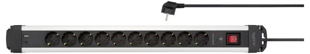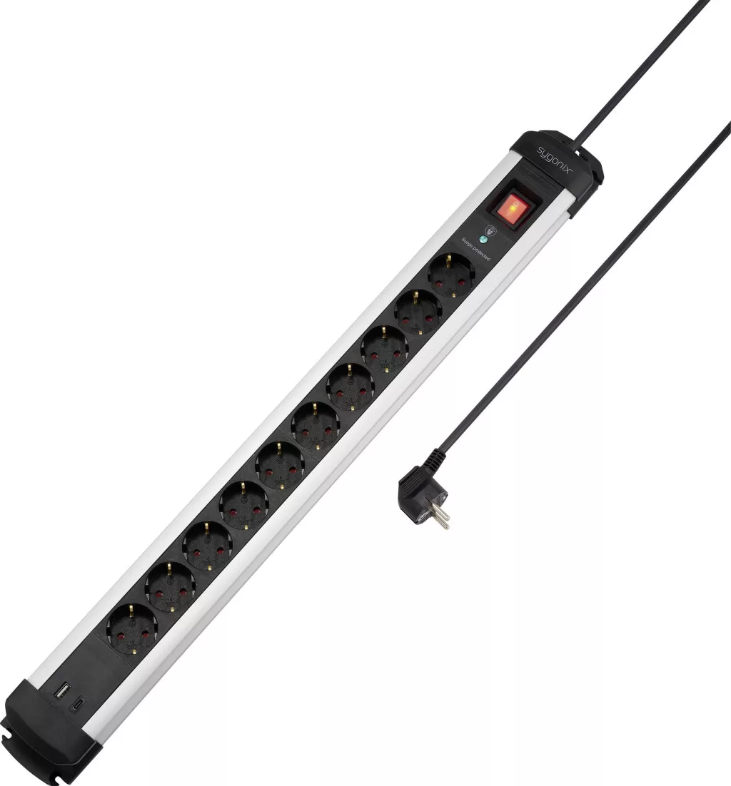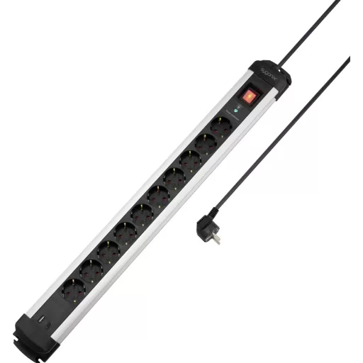 Technical specifications: Product.PlasticfreePackaging: #####PlastikfreieVerpackung · Alkalmazási terület: Beltér · Anyag: Alumínium · Csatlakozási teljesítmény: 3680 W · Dugaljak száma: 10 · Hálózati csatlakozó típus: Védőérintkezős · Hálózati elosztó jellemzők: Kapcsolóval,USB-vel,#####mit USB-C®,Túlfeszültség elleni védelem · Kivitel: USB-A: 5 V/DC 2,4 A, max. 12 W.